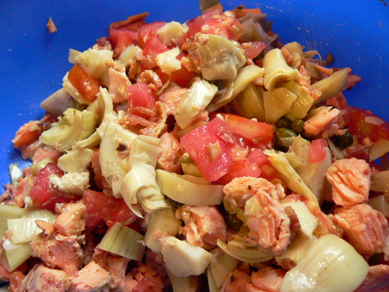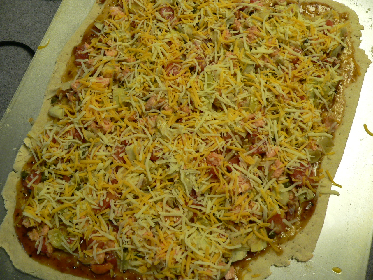 We had so much fun making the first pizza, we decided to make another one using the leftover dough. This time, we used a bunch of stuff we had in our refrigerator: Apricot Ginger Salmon, Apricot Ginger with Horseradish Marinade, Artichokes, Capers, Bacon, Shredded Cheese, and Tomatoes.