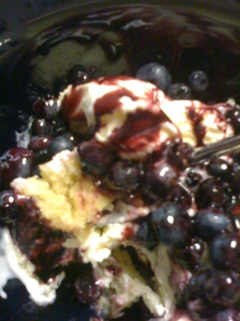 After dinner, Jon put together a phenomenal dessert: Coconut pound cake and Fresh Blueberries from the East State Farmer’s Market, Breyers Natural Vanilla Ice Cream and Red Wine Reduction Syrup, which he whipped up a couple weeks ago to have on hand, just in case.