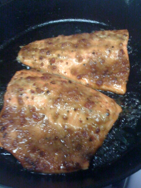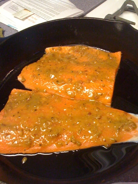 Hello world! It seems appropriate that my first blog post should center on food. My husband, Jon, loves to cook and he is really, really good at it. Over the course of the past year or so, he’s found his niche, taking existing recipes and adjusting them just enough to make them his own. Tonight was no exception. As we brainstormed about what to eat, he set off for the store for four items: flour, eggplant, fish and batteries (obviously this last item was not for a recipe). He returned with most of those items, though he forgot the flour and the batteries, along with some fresh kohlrabi, and he set to work. The result? Baked Salmon with Apricot Ginger Sauce and a Kohlrabi salad with home grown veggies and homemade dressing.