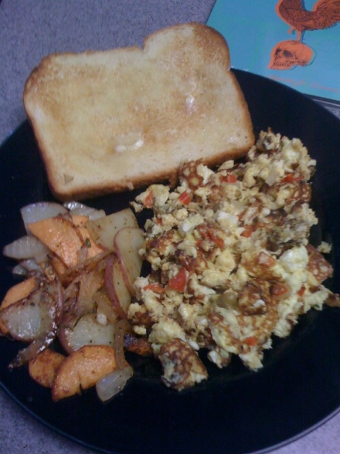 I would have been satisfied with cereal for breakfast, but Jon had other plans. He offered to make me an omelet and disappeared into the kitchen. When he emerged, he held a plate overflowing with yummy goodness: fried potatoes, scrambled eggs and toast. Of course, these weren’t just any ol’ fried potatoes, scrambled eggs and toast. Jon added his “twist” to them and the result was pure perfection. And the best part is, he made everything from stuff we had leftover in the refrigerator, hence the title of this post- His Version of Garbage.