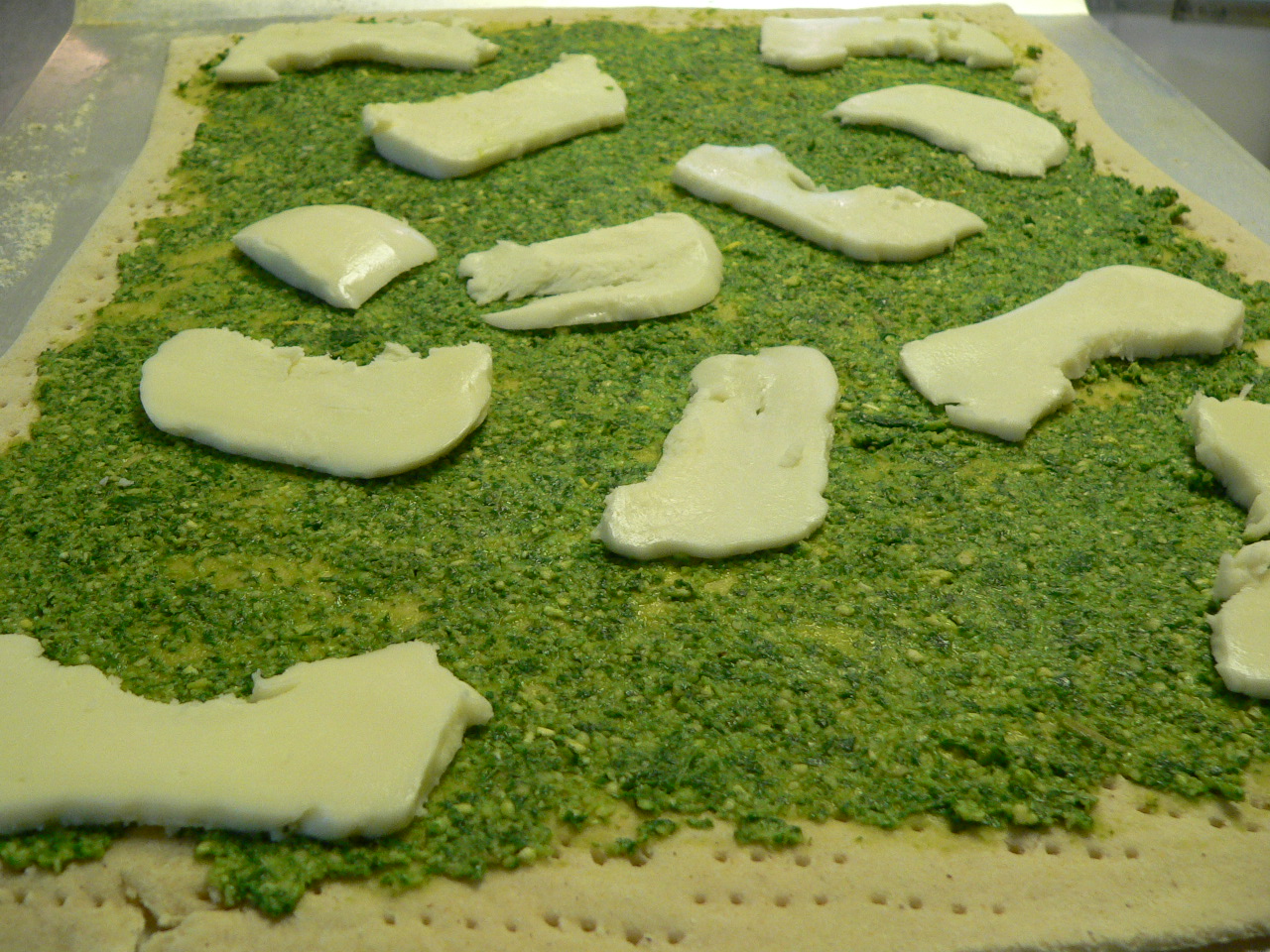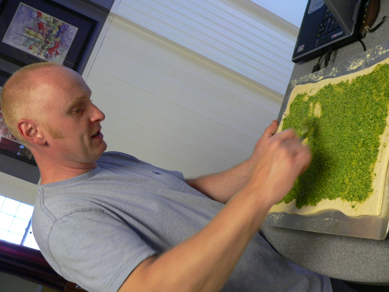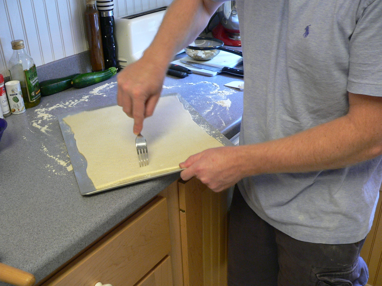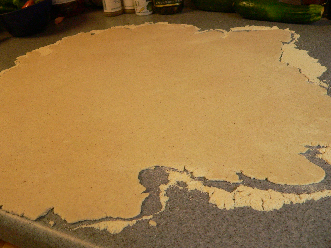 Yesterday, during our what-shall-we-eat brainstorming session, Jon and I decided to try our hand at making homemade pizza. We love cracker-thin crust and just haven’t found any we truly love in town. So, we looked at various recipes and used a combination of several to create ours. We prepared the dough yesterday and refrigerated it overnight. Today, we rolled it out and prepared our choice veggies. Usually, I let Jon do all of the prepping and cooking, but today I helped out and enjoyed myself immensely.