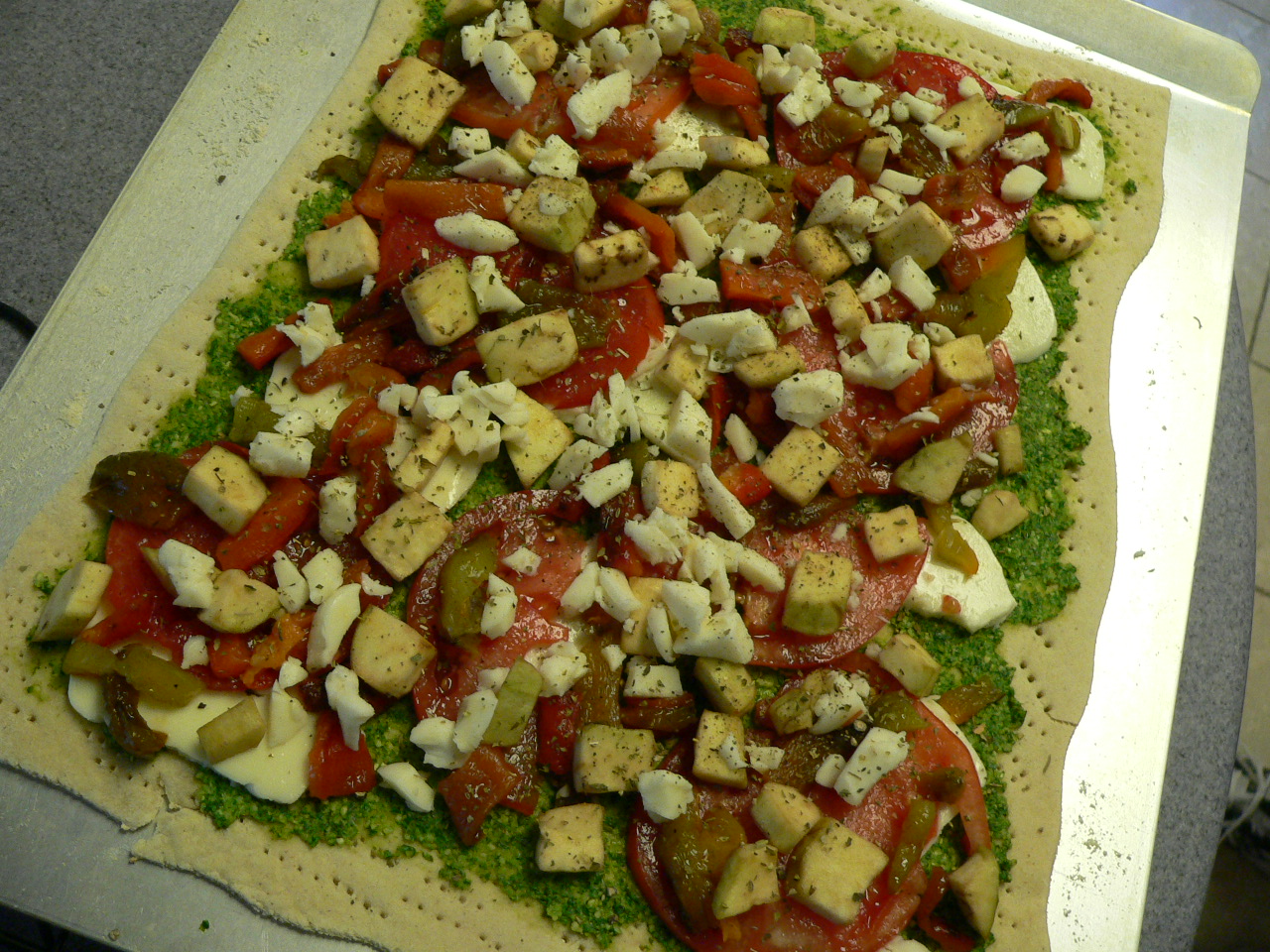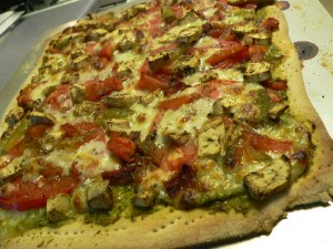 Follow instructions for pizza dough (we used ½ flour and ½ Quaker Masa Harina De Maiz). Because we like cracker thin crust, we rolled it very thin. Dice eggplants, roast red and green peppers and remove skin, and slice mozzarella. Spread pesto over pizza crust and mozzarella, tomatoes, red and green peppers, eggplant, salt, pepper and oregano. Put back into the oven at 500 degrees and cook for 12-16 minutes or until the dough is crispy and brown. (We cooked ours for 16 mins and rotated half way through).