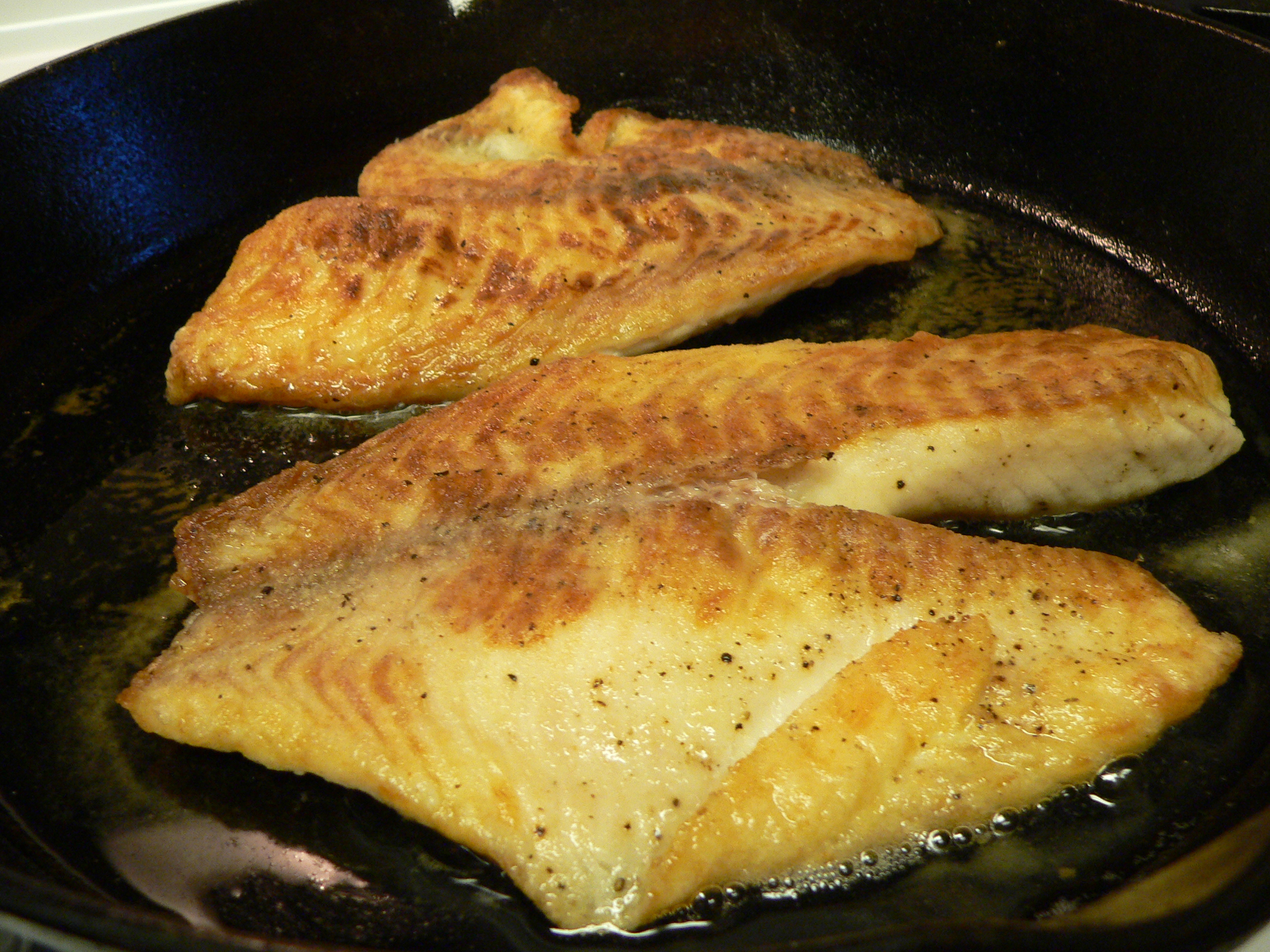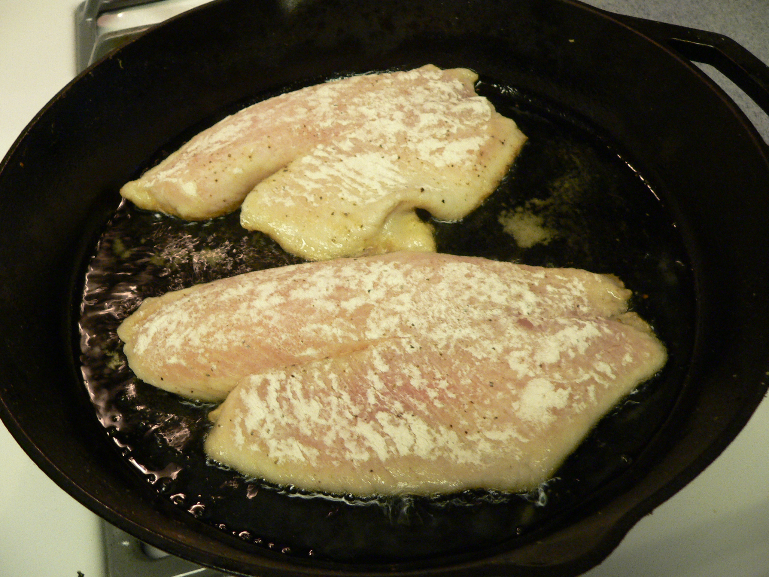 Wash fish, pat dry. Sprinkle and press in salt and pepper. Toss in flour. Pan fry in a thin layer of Canola oil.