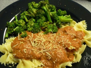 Earlier this year, Jon’s mom and sister traveled to Italy and brought back an authentic Italian cookbook for him. Many of the recipes are rather involved, but every once in awhile, he gets inspired, rolls up his sleeves, and dives in. This time he pulled out a recipe for tomato sauce to help us deal with the overabundance of tomatoes from our garden. We made the sauce earlier in the week for fish fillets and reused with bowtie pasta, al dente, and fresh steamed broccoli from the garden.