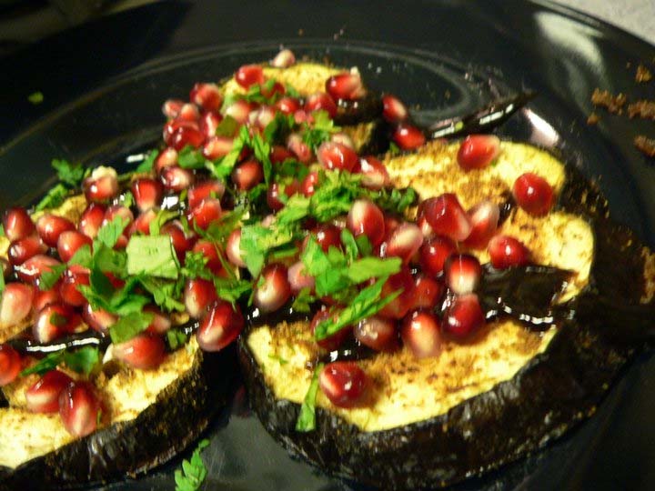 Jon’s ability to combine flavors that I’d never think to combine never ceases to amaze me. A few weeks ago, he decided to make Cumin Scented Eggplant with Pomegranate Molasses and Cilantro. The way he tells it, he searched high and low for the molasses, only to find it a few blocks away at a small convenience store. I think he will check there first next time. But the search was well worth it. The result: the most flavor-intense eggplant I’ve ever tasted.