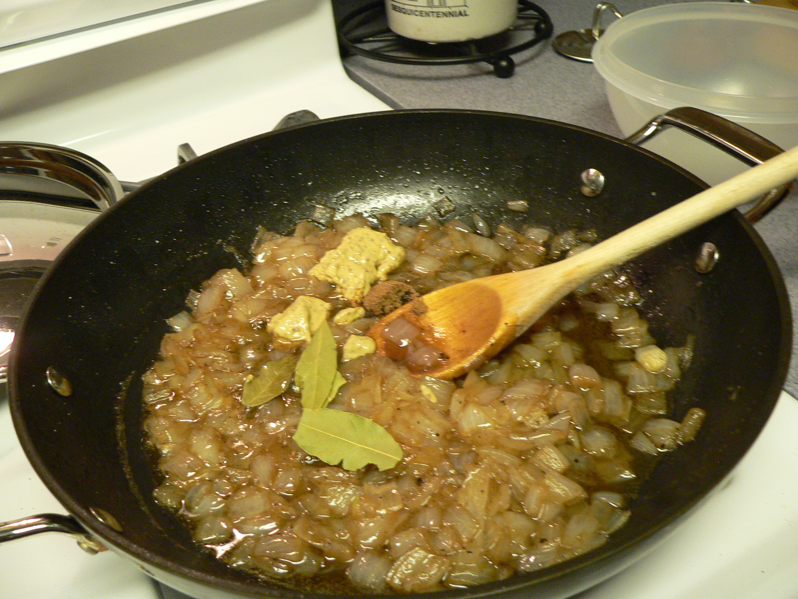 Tonight was kind of hectic. Jon had to go back to school to do some lab work and I had a pilates session, taught by Tresa Meussling, with the lovely Leah Chester. We usually eat dinner early in the evening, but tonight, it was after 8 before we were ready. This meal was totally worth the wait and though it doesn’t receive an “ah mazing” rating, it was “pretty darn good.” Beer-and-Onion Braised Chicken Carbonnade with Roasted Garlic Mashed Potatoes, “with the skin on; it gives you vitamins,” Jon emphasizes. That makes all the difference.