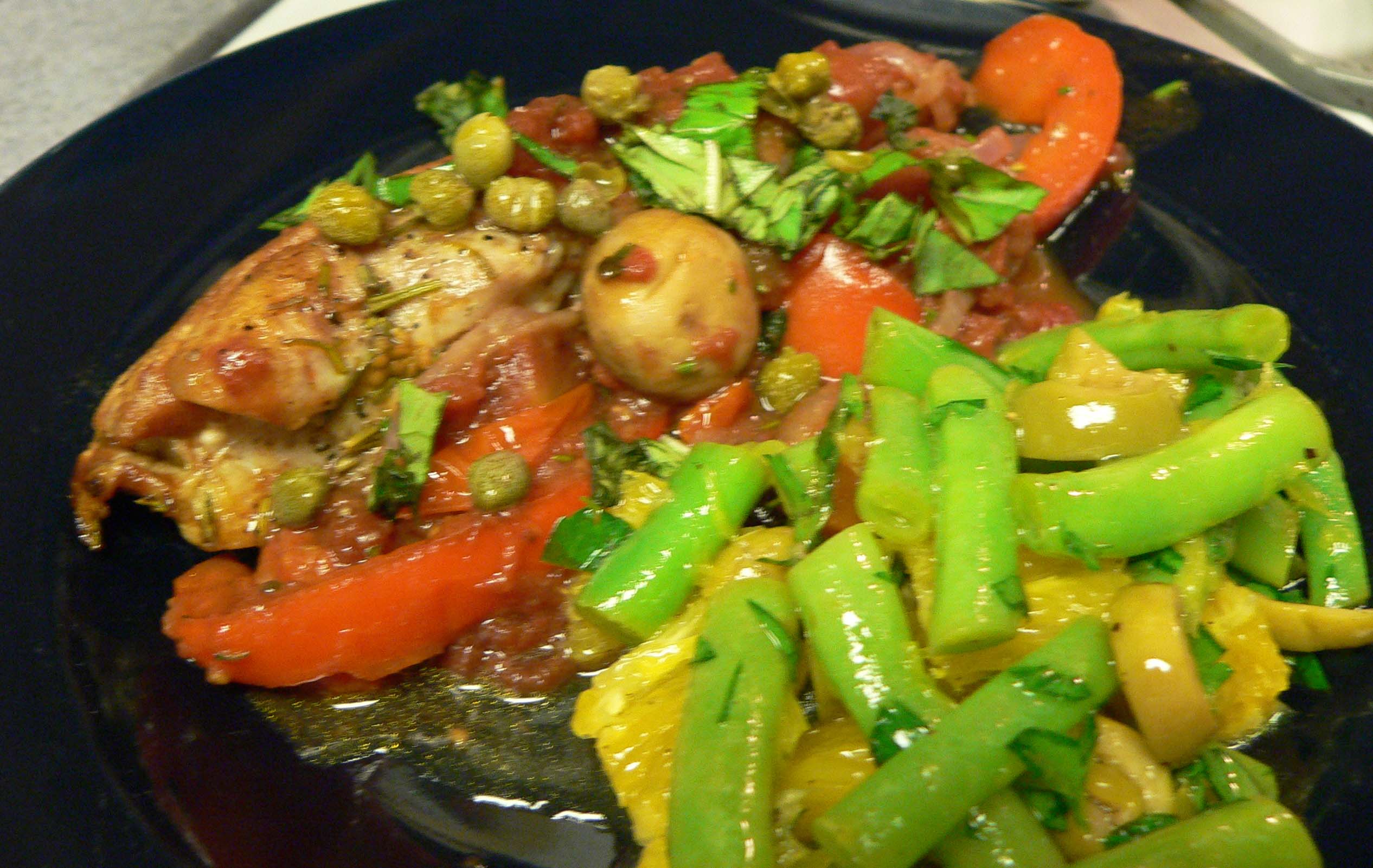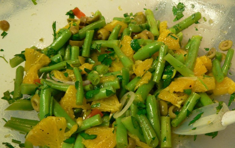 When I walked into the house this evening after work, the house smelled amazing… wait, I mean “ah mazing.” Jon was cooking up some Chicken Cacciatore with Green Bean, Orange and Green Olive Salad. I turned my nose up at the Green Beans, but after one taste, I knew it was a miracle. I don’t think I’ve ever eaten green beans and liked it. In fact, some of my most painful memories involve me, sitting at the dinner table, long after everyone else had been excused, forced to eat the 3 or 4 green beans my dad had dished onto my plate. Horrifying. Traumatic. Life altering. And then today, I ate green beans and loved them. Jon truly is a miracle worker. Additionally, this further proves his theory that I will eat anything if it’s combined with oranges and green olives.