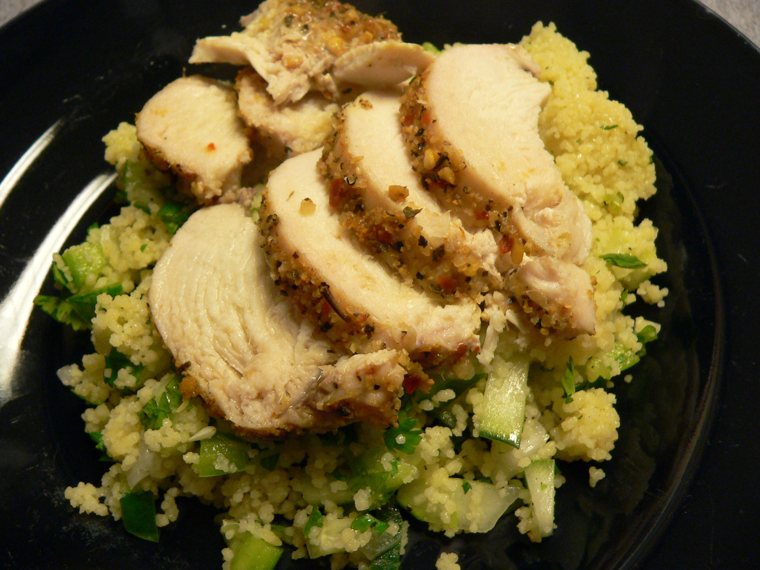 In November, I stumbled upon Chicago Now’s blog Clean Convenient Cuisine and was immediately drawn to something it dubbed a “pre-marathon meal.” Make no mistake, I had no intention at the time to run a marathon, but the flavor combination of this dish drew me in. As is my habit, I emailed it to Jon and he made it for me that evening. In fact, he made enough to last me the entire weekend while I was out of town with friends. I’d never had Quinoa before, but I will certainly have it again, as often as I can. Apparently it is considered a “healthy carb.” And though difficult to find in our city, left to Jon, he can find anything, even if it takes him 7 stores to do so like the pomegranate molasses he needed for the Eggplant recipe I posted a few months ago.