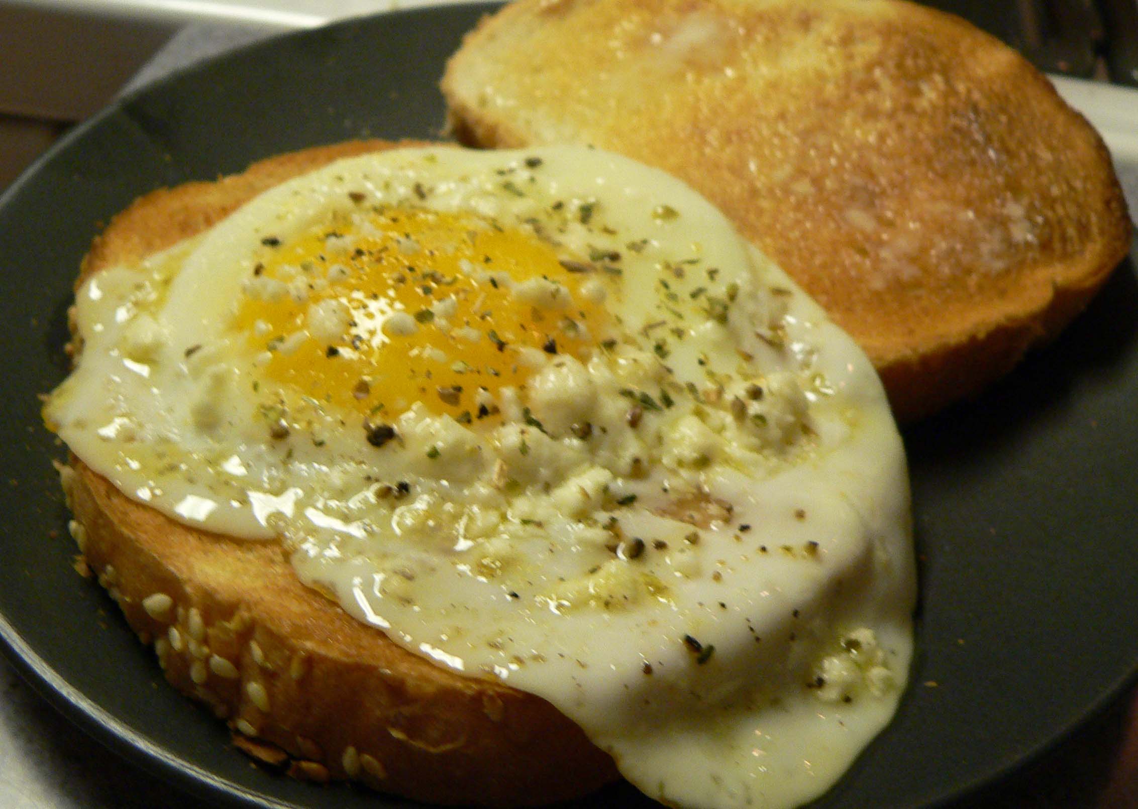 Heat the oil over medium heat. Throw in the egg. Cook until whites are white. Sprinkle with feta, onion powder, thyme, oregano, salt and pepper. Toast the bread and butter generously on one side. I use Mayo as well. Assemble sandwich, butter side in. If you are lucky, the yolk will still be a bit gooey. That makes for some tasty plate cleaning.