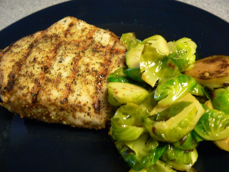 This is one of those “wing it” dishes. Mix up some of your favorites spices- here we used lemon pepper, thyme, garlic, salt and pepper. Coat the pork chops with the mixture and grill to your liking.