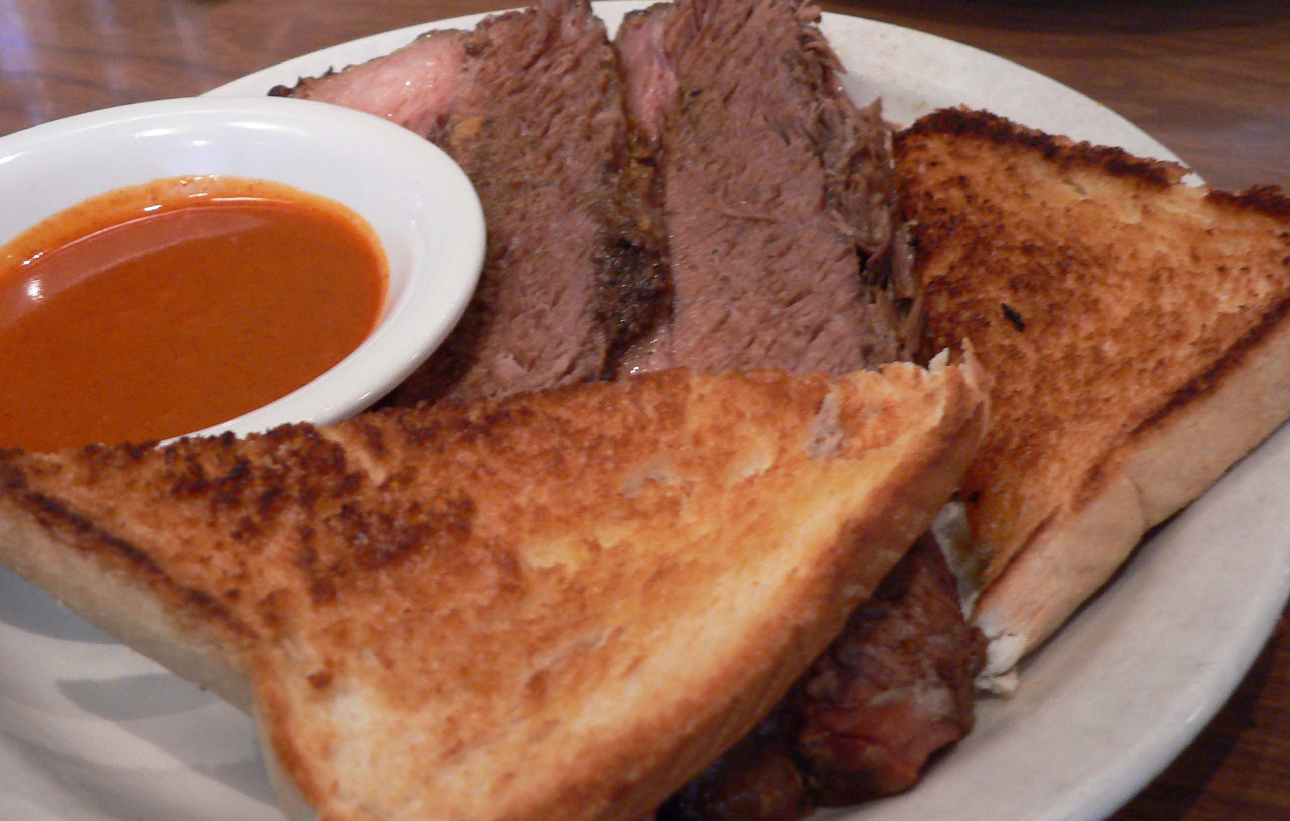 I was pleasantly surprised to see a new menu that extended beyond the typical bar fare, and the items seemed fairly priced. Unfortunately, as slow as they were, it took several minutes before anyone acknowledged our existence… and it was all down hill from there. The service was anything but prompt, and we never did get refills on our drinks. I ordered the barbecue beef brisket and Jon ordered the chicken nachos, which were on special. The brisket was pretty good, especially the barbecue sauce, which was spiced up with Louisiana hot sauce, though the menu said it would be served with a toasted kaiser roll. It wasn’t. Instead it came with two pieces of dry toast. Jon’s nachos were anything but impressive. Stale brown chips, covered with chicken, cheese, shredded lettuce and tomatoes. To top it off, they brought him the wrong nachos and they had to be returned.