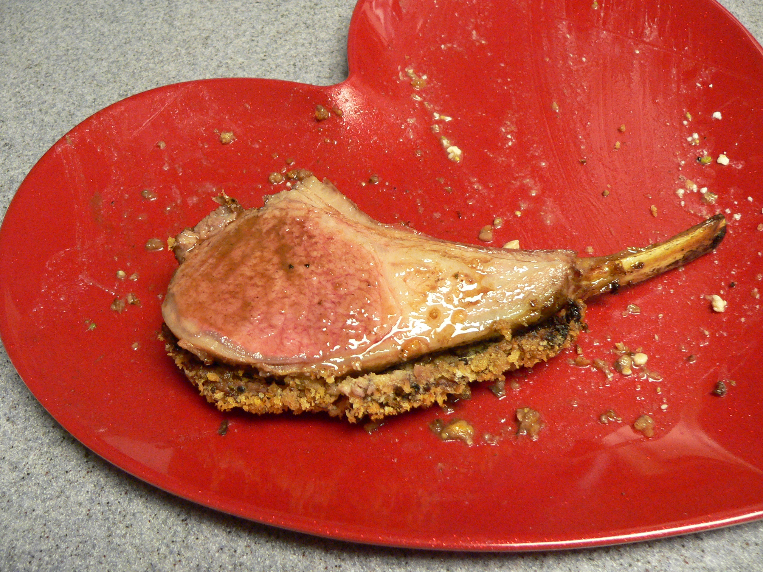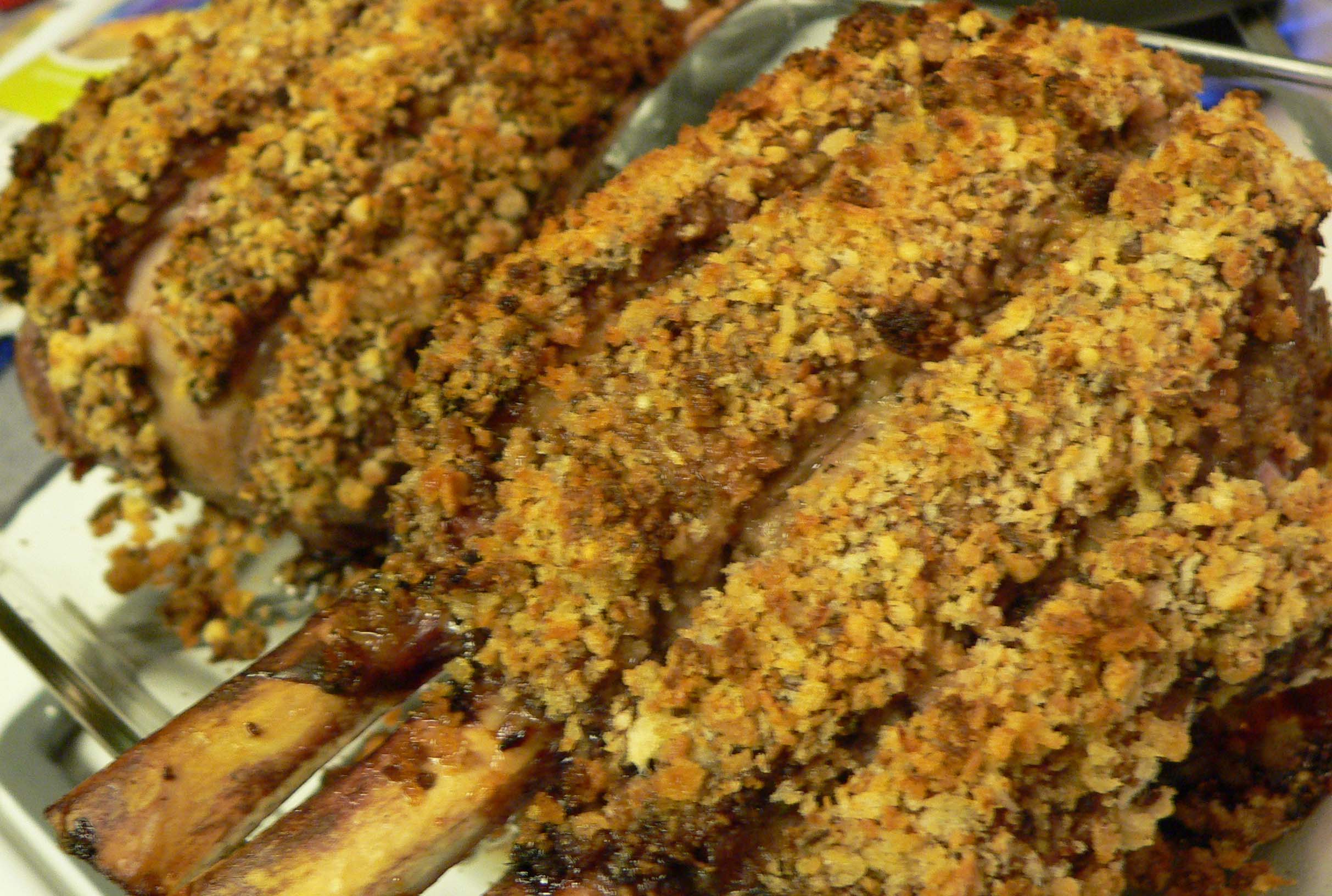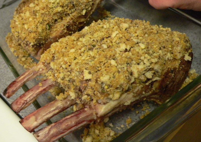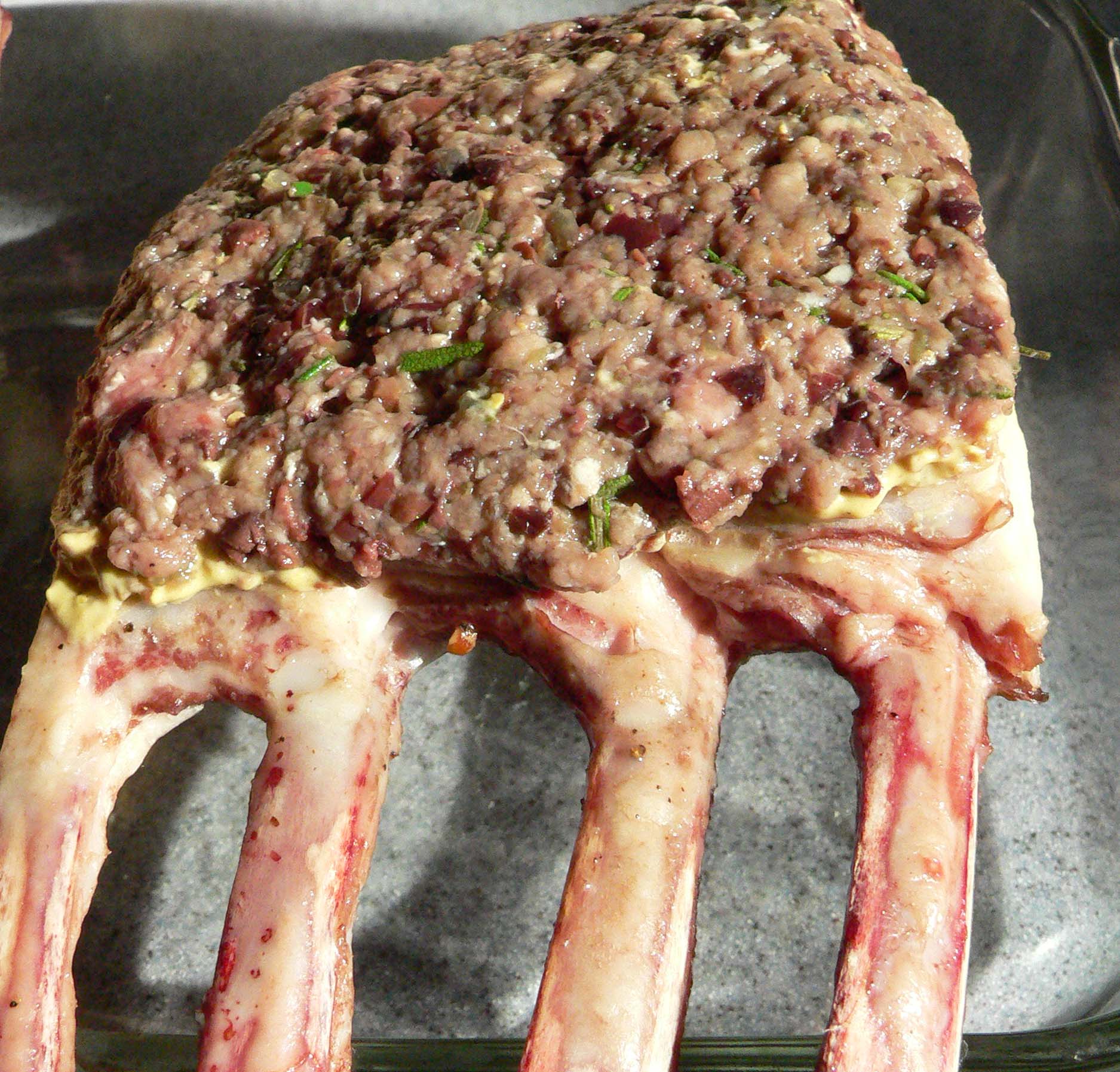 The rack of lamb, covered with the lamb sausage, now with bread crumbs, preparing to head into the oven.