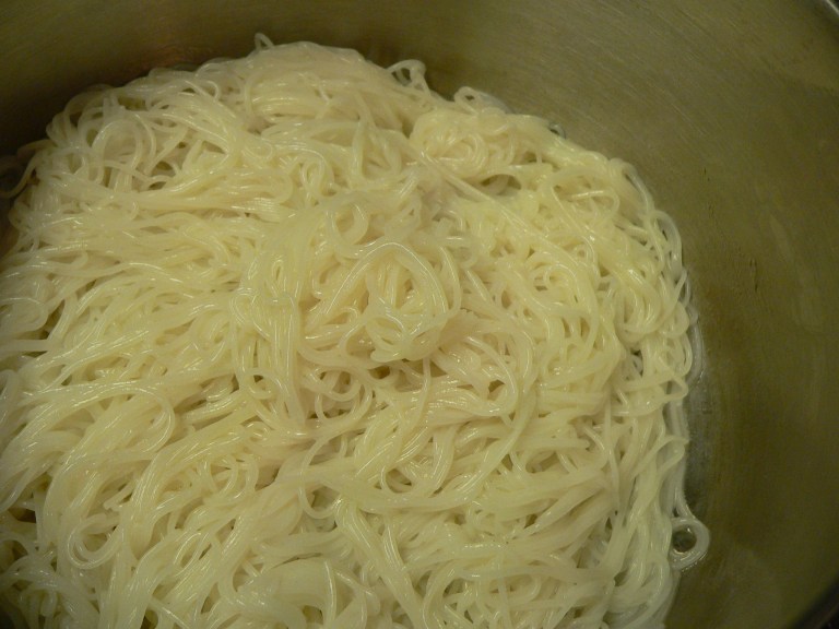 Prepare vermicelli according to package instructions and steam broccoli with chopped white onion until warm. I like them to keep a little of the crunch. In the meantime, use a vegetable peeler and shave carrot. Chop chives. When the noodle are cooked, place in strainer and run them under cold water. Return to pot and mix in oyster sauce, fish sauce and sesame oil to taste. To plate the dish, add noodles, then broccoli and top with carrots, bean sprouts and chives. Sprinkle with soy sauce and oyster sauce.