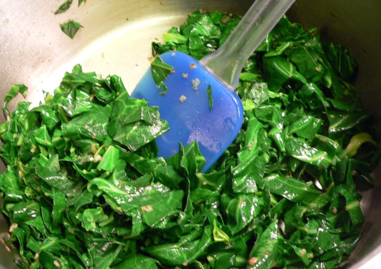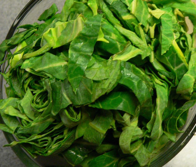 Stack half of collard leaves and roll into a cigar shape. Cut crosswise into very thin strips (1/16 inch wide). Repeat with remainder.