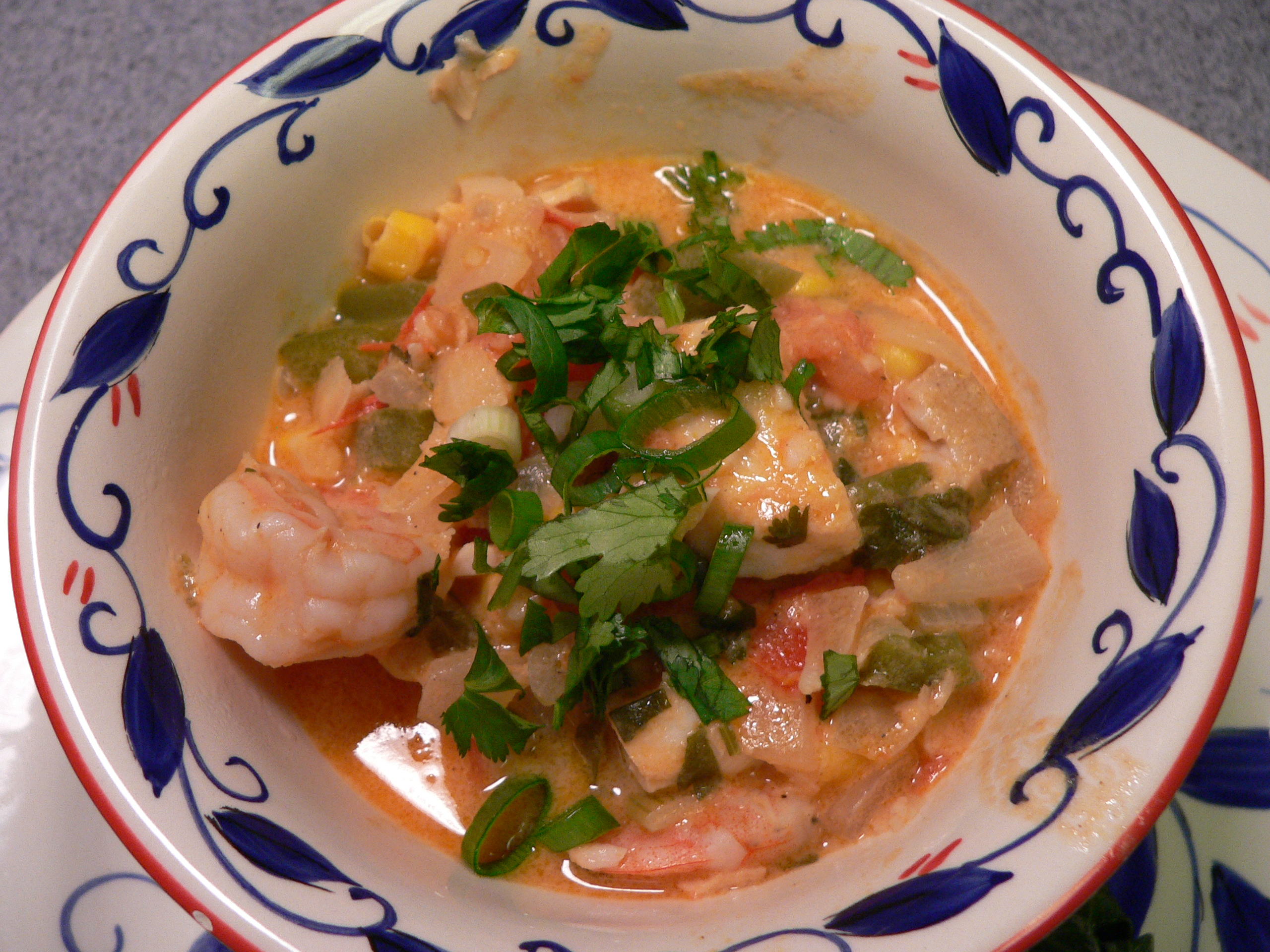 Heat remaining 2 tablespoons oil in large pot over medium heat. Add onion, bell peppers, garlic and crushed red pepper; sauté 5 minutes. Mix in tomatoes, coconut milk, tomato paste, corn, half of cilantro and half of green onions. Add shrimp and fish with marinade. Simmer until shrimp and fish are just opaque in center, about 5 minutes. Season stew with salt and pepper. Transfer to bowl. Sprinkle with remaining cilantro and green onions.