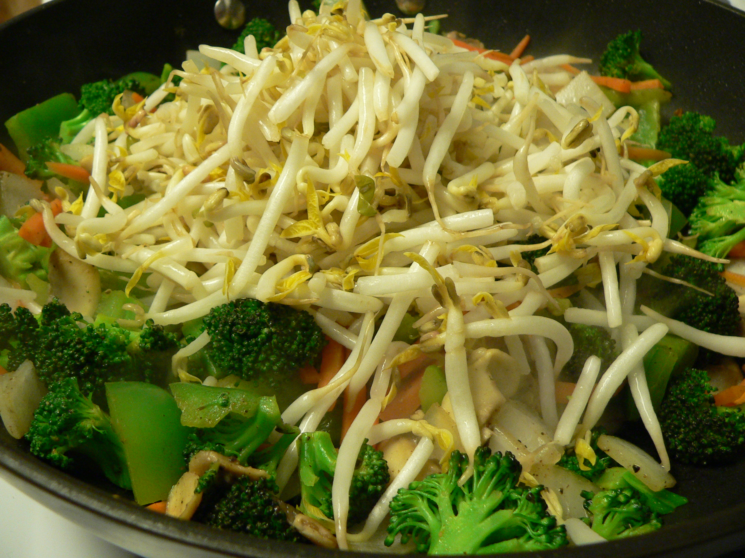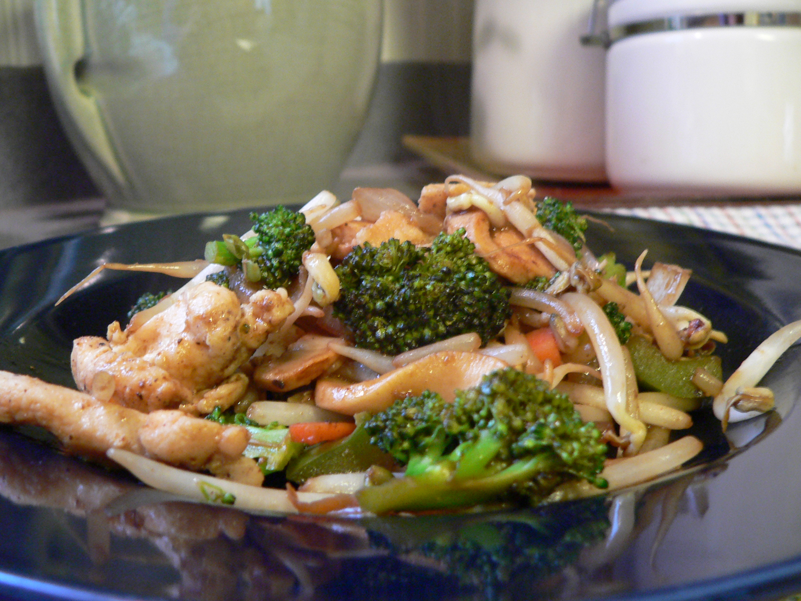 Slice the chicken and sprinkled with spices. Dice the veggies. Heat the wok and then put the oil in. Allow oil to heat- it will happen quickly. Add chicken. Cook chicken until pink is gone. Remove chicken and set aside. Add veggies (except bean sprouts) to wok with salt and pepper. Heat and stir until broccoli is half done. Add chicken and bean sprouts, mix well. Pour in sauce, mix. Turn to stove low, cover and cook until veggies are soft (3-5 minutes).