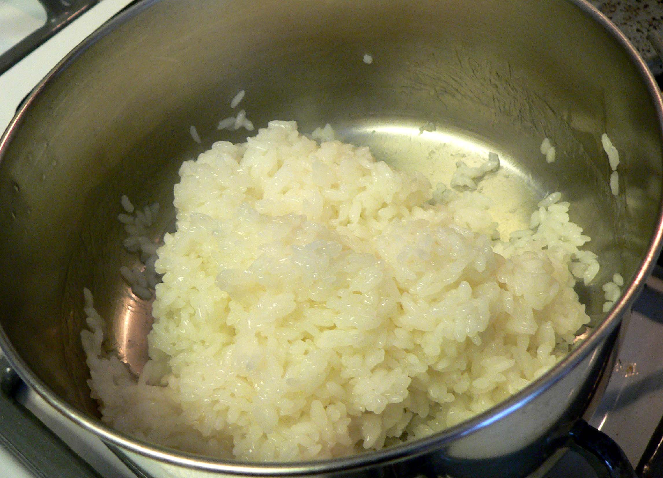 *Because the rice is sticky, I found it helpful to keep a bowl of water next to me to dip my hands in before handling the rice. Instead of using my wooden spoon to spread the rice around, I used my hands. The rice sticks to the spoon, making it difficult to spread smooth.