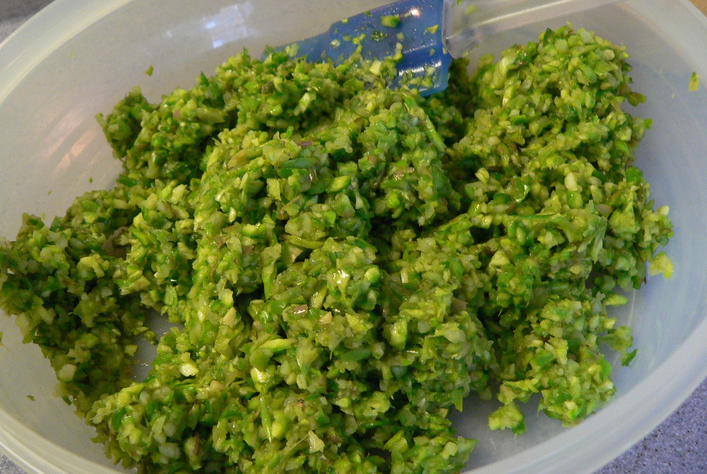 Finely mince ginger and garlic in food processor. Add asparagus and the remaining ingredients; using on/off turns, process until asparagus is finely chopped but not pureed.