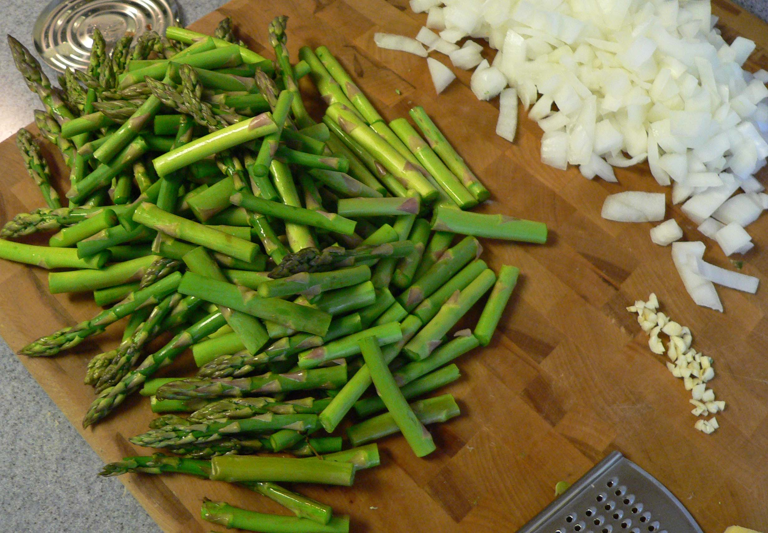 - 12 ounces fresh asparagus, trimmed, quartered crosswise