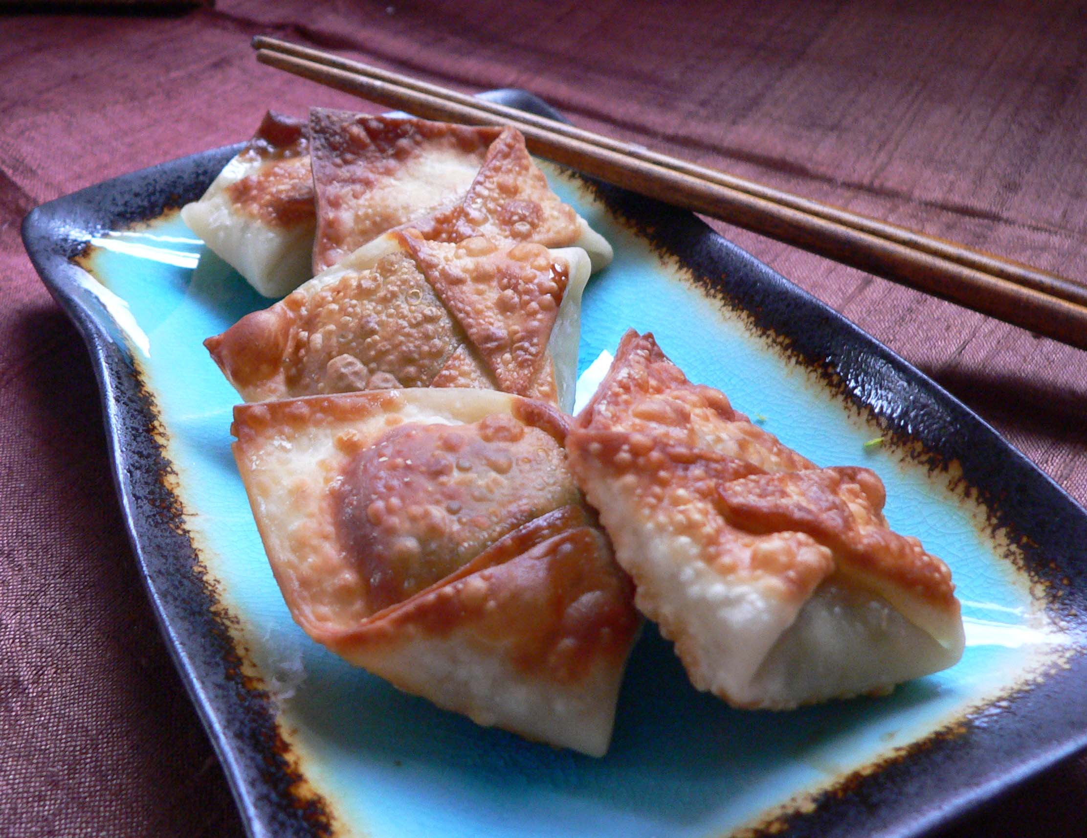 Lay out 12 wonton wrappers at a time. Put a teaspoon of the filling on one side of each square. Be careful not to overfill. If you do, your dumplings won’t seal. Disperse filling on all 12 wrappers before starting to fold them. When ready to fold, keep a bowl of warm water next to you to use for moistening your fingers. Use a wet finger to moisten the perimeter of each wonton square, then fold one side over onto the other and seal to make a triangle. It’s okay to be liberal with the water. Then, fold in the arms of the triangle and press them together with a little water. Set aside. Once you have assembled the first set, continue with another set of 12 and so on until you have used all your filling.