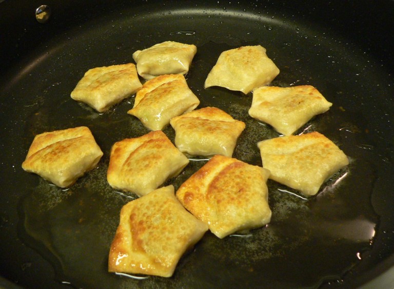 To fry the dumplings, heat a pan to medium-high, add enough oil to coat the bottom. Put in one layer of dumplings, and cook a couple of minutes until dark golden. Flip and cook the dumplings on the other side for another minute or two until golden. (It helps if you have tongs.) Continue, adding more oil if needed, until all the dumplings are cooked.