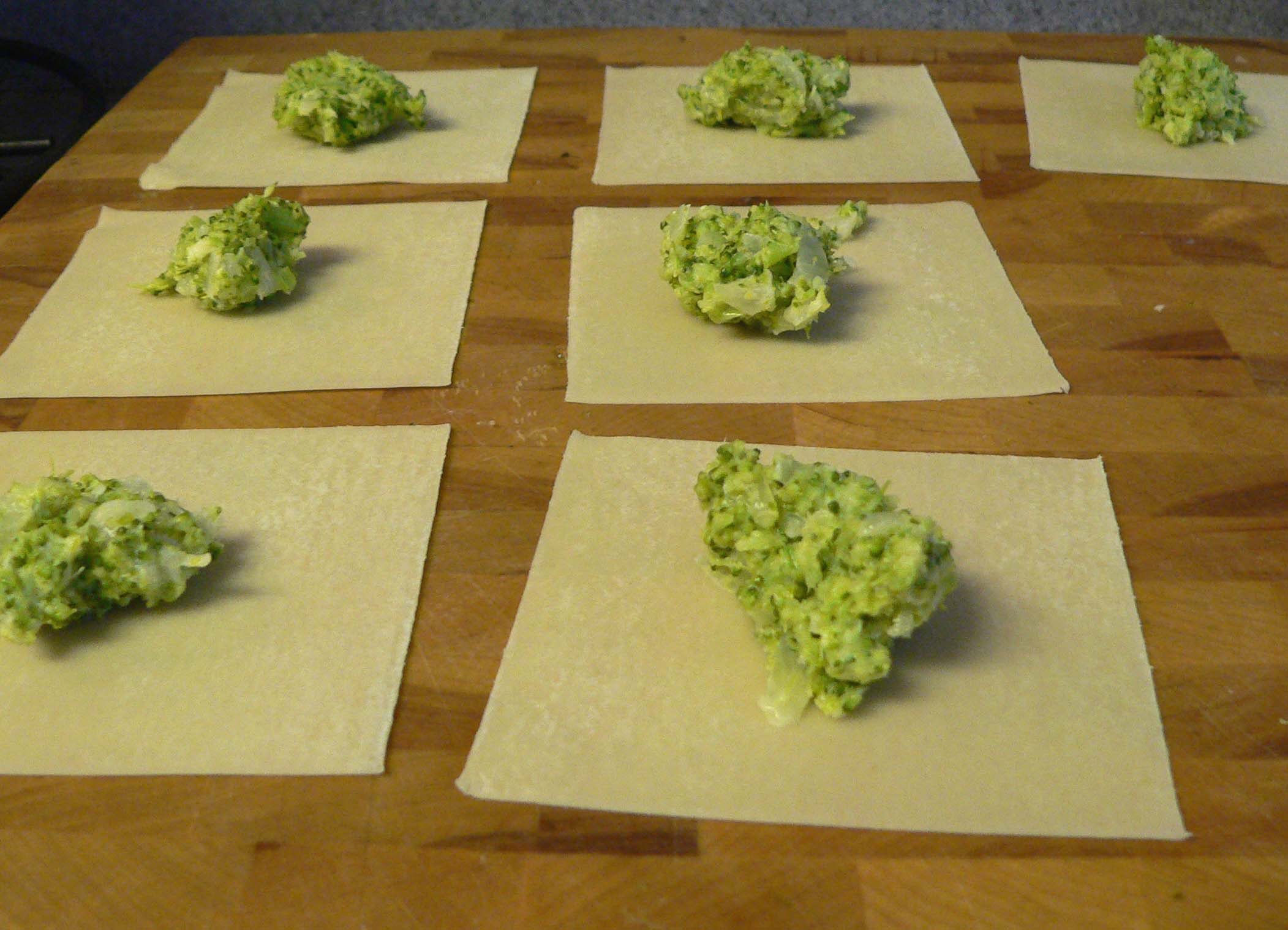 Steam the broccoli until bright green and cooked through. Let cool and then chop well. In a large saucepan, heat a tablespoon of olive oil over medium heat, add the onion and cook for about 3 minutes, until softened. Stir in the garlic and 2 tablespoons ginger, cover and cook for about 5 minutes until soft. Stir in the heavy cream, turn the heat down, and cook for a couple minutes until thickened. Stir in the broccoli.