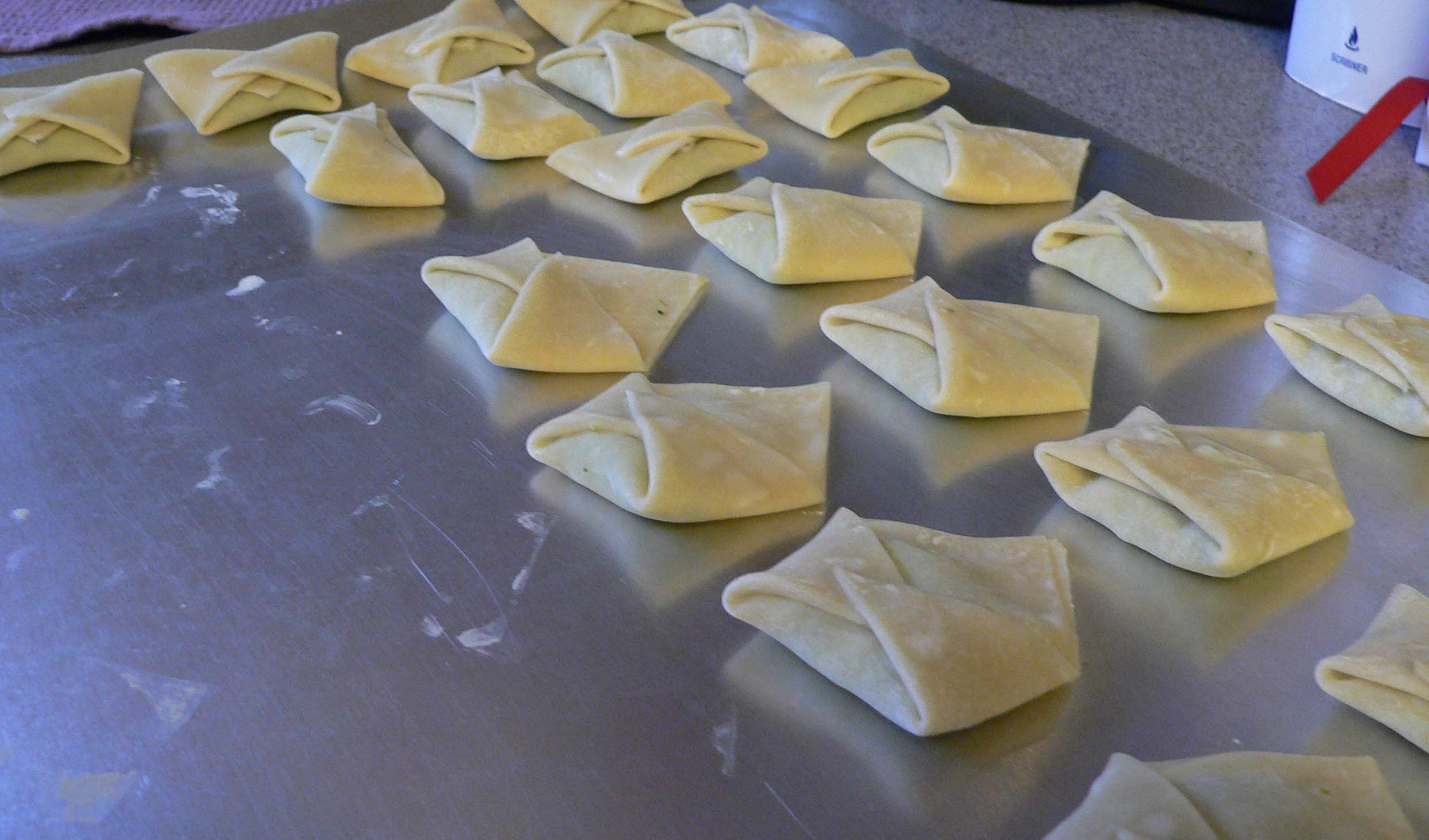 I folded my Jade Dumplings differently so I could tell them a part. Fold one side onto the other and seal to make a triangle. Fold top down and press lightly. Fold in the arms and press them together with a little water.