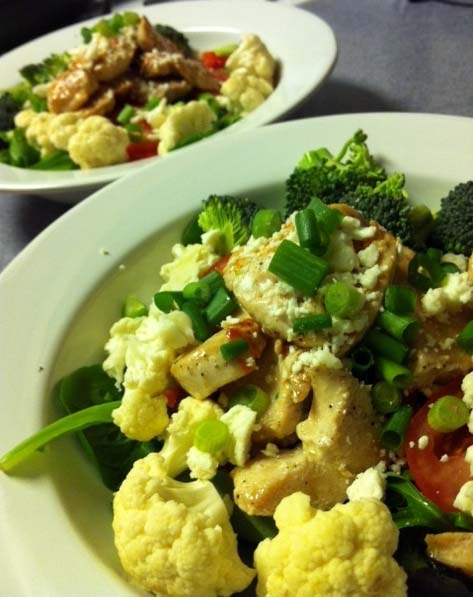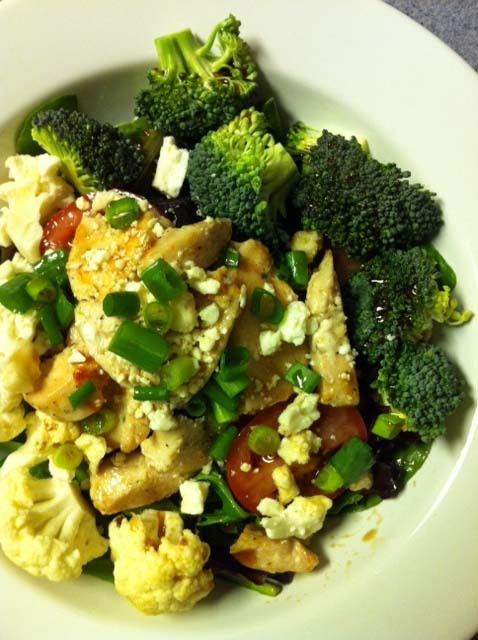Sigh. That meant I needed to stop by the grocery store and I had no idea what to get. He quicky read what we did have in the fridge: cauliflower, broccoli, red peppers, spinach, scallions, and thawing chicken breasts. “Okay,” I said, still without a clue what I would get at the store. I ended up with some mixed greens, 2 Roma tomatoes and a bottle of Moscato and whipped up one of the best salads we’ve ever had.