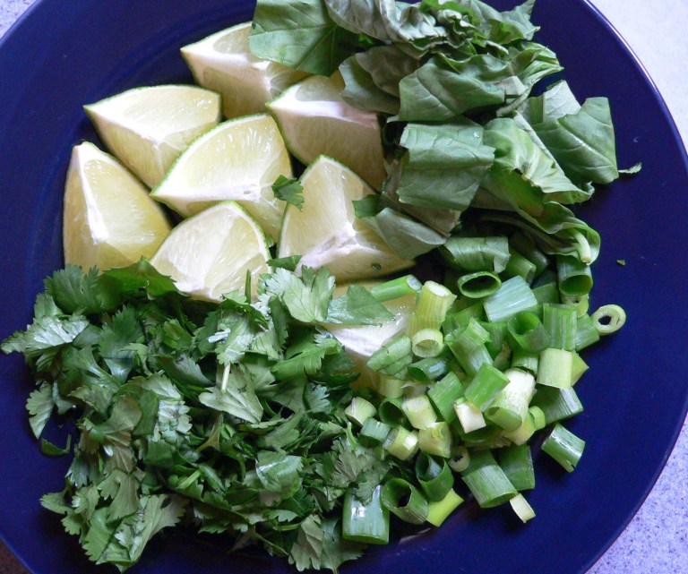 To tide us over, I did some searching and found a healthy Pho recipe. Though it is not authentic Pho (who has time to simmer beef or chicken bones for hours on end anyway?), it is easy to make and is super tasty. We especially love all of the fixin’s: fresh basil, cilantro, lime and scallions. And don’t forget the soy sauce and Sriracha.