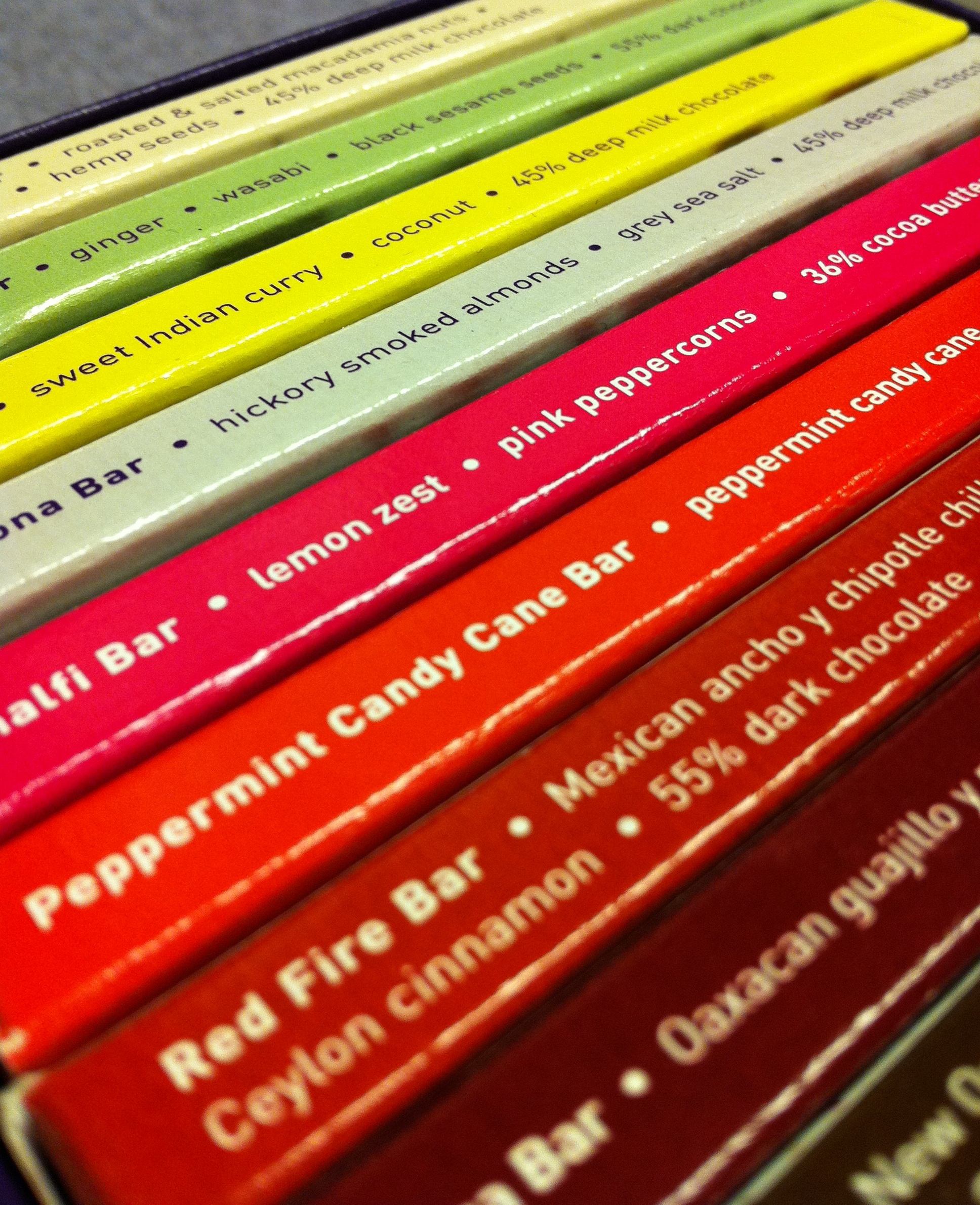 I finally landed on a variety pack of mini exotic candy bars, including flavors like Roasted & Salted Macademia Nut with Hemp Seed, Ginger/Wasabi/Black Sesame, Sweet Indian Curry/Coconut, Lemon Zest/Pink Peppercorns, Hickory Smoked Almonds with Grey Sea Salt, Peppermint Candy Cane, Mexican Ancho and Chipotle Chillies with Cinnamon, and Chicory Coffee/Cocoa and Bittersweet Chocolate.