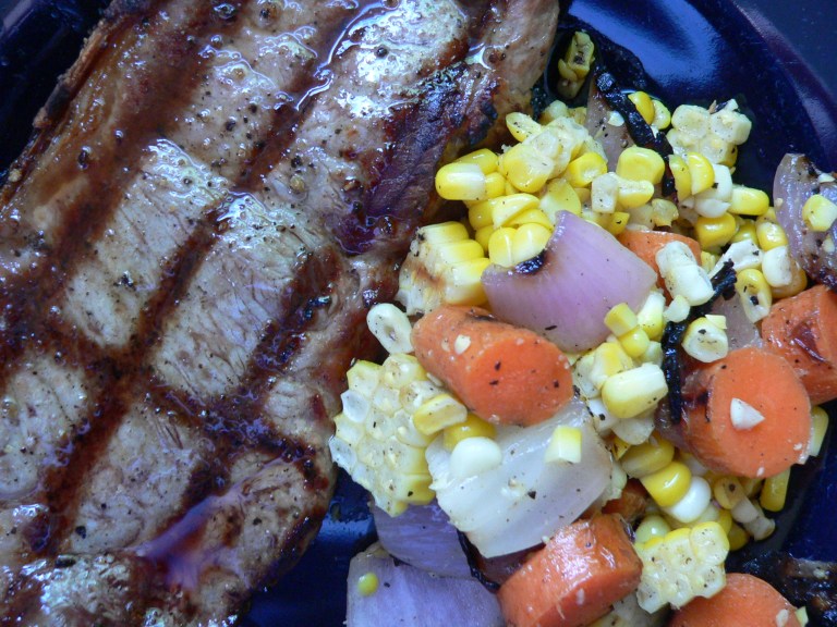 Grill the corn on the cob, carrots and onion on the grill (about 10 minutes). Remove veggies from grill and allow to cool. Chop veggies and toss with olive oil, salt and pepper. Easy!