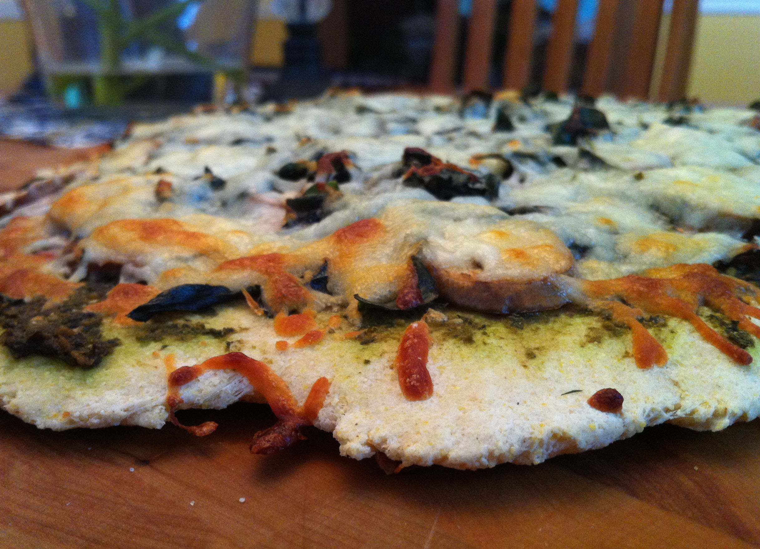 Overall, the pizza turned out great- the fresh basil, combined with some pesto we made a few weeks ago, really packed a lot of flavor into each piece. The texture and taste of the cornmeal crust, typically used for a mexican style pizza, added interest and ended up complementing the flavors well. In just under an hour, we had a fresh and tasty homemade pizza.