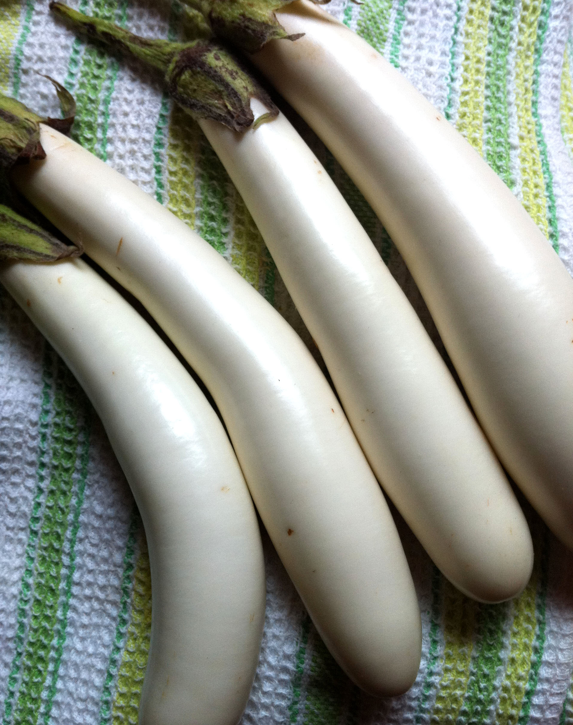 Saturday morning, Jon and I visited the Barr Street Market and picked up some white eggplant, also known as melitzana, which are long and slender vegetables and contain less water than “normal” eggplant. Early Sunday morning, Jon harvested a ton of basil and oregano from the garden, so I decided to make an eggplant and basil pizza. Usually, we use a crust containing yeast that must rise overnight, but this time I found a recipe for a cornmeal crust that was ready in minutes.