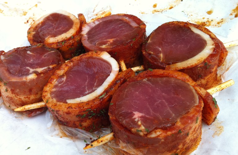 Saturday, Jon and Tracy went out for a beer run and were gone FOREVER. I was starting to get cranky, and then they pulled up with a car full of deliciousness- bacon-wrapped Pork tenderloin from Jamison Meats and several ears of corn on the cob. All was forgiven immediately.