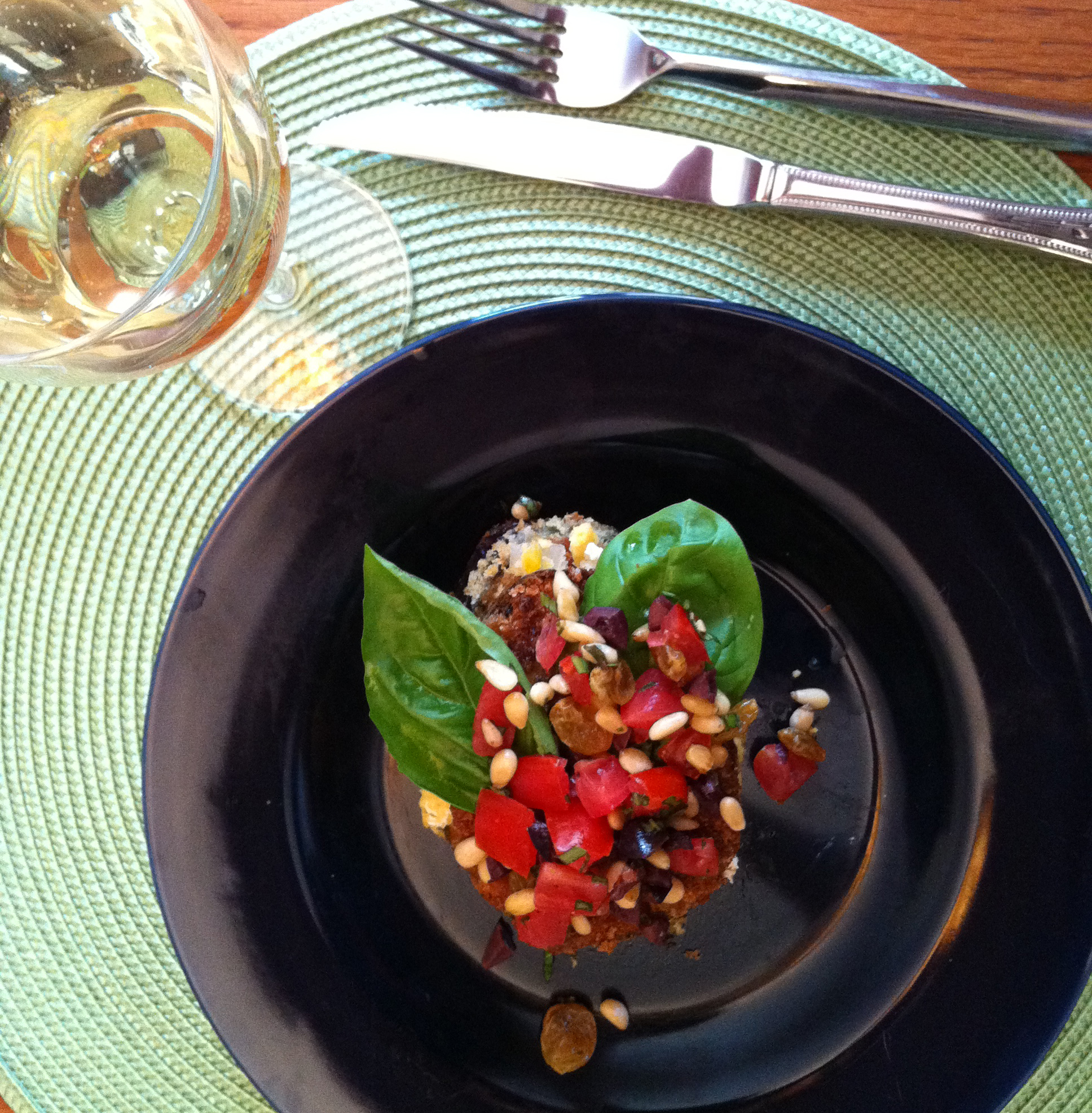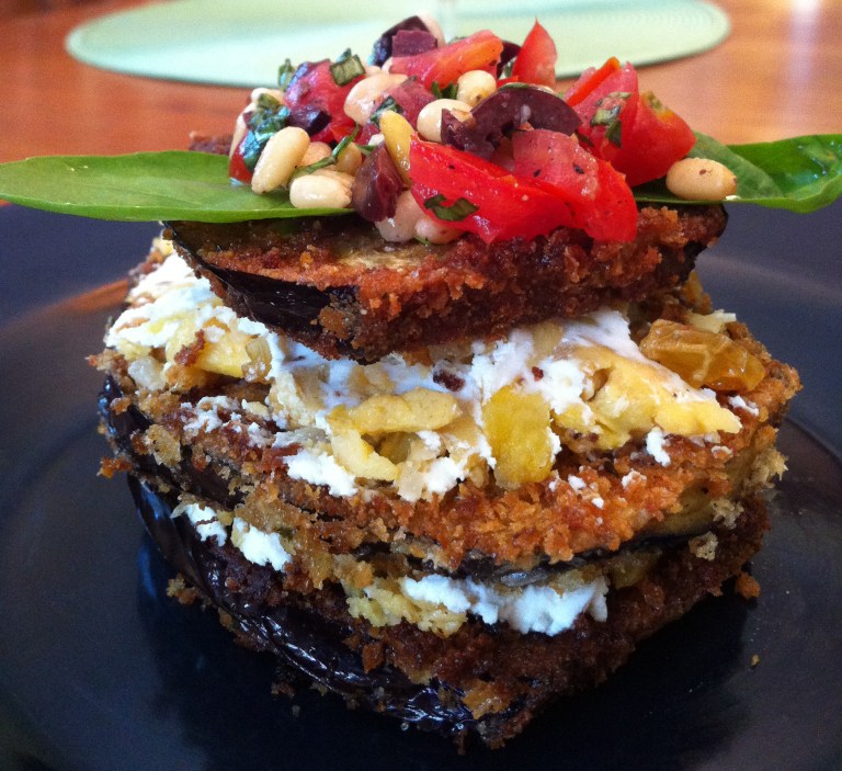 I’ve been waiting with much anticipation for this week’s issue of whatzup Magazine so that I could share this recipe with my blog readers. Though time-intense, for me, this dish is more than worth the wait. A complex combination of fresh flavors drive this dish past Ah-mazing. I am so glad eggplants are finally blooming in the garden. I just can’t get enough.