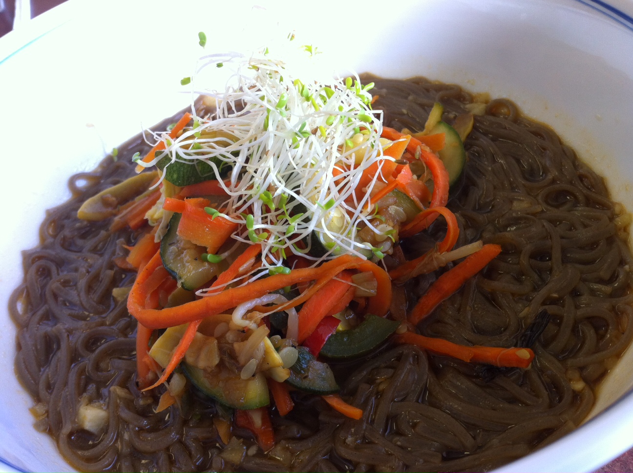 The menu, which features a plethora of vegetarian options, is written neatly on the chalkboard wall, and items appeared to be priced appropriately. Jon ordered the Thai-Me-Up ($7.50), a whole wheat flatbread wrap filled with carrots, Nappa cabbage, snow peas, broccoli, lemon basil, and garlic, served with organic rice and sweet chili and coconut curry dipping sauces. I ordered the Lemongrass Noodle Bowl ($7.50), one of the vegan dishes listed, made with organic whole wheat noodles, tossed with shiitake mushrooms, scallions, snow peas, heirloom tomatoes, carrots, roasted ginger and house vegetable broth.
