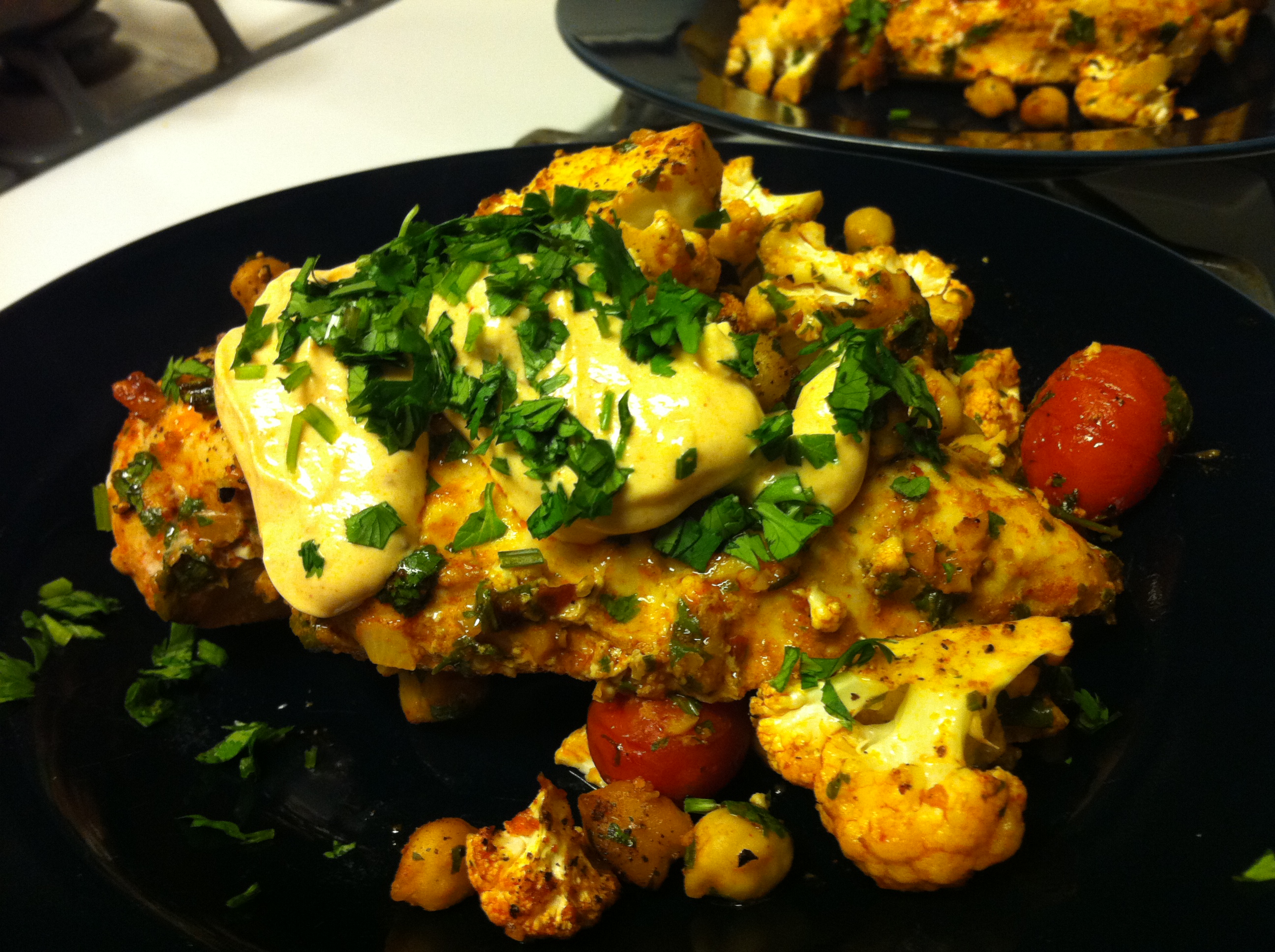 Preheat oven to 450°. Mix first 5 ingredients in medium bowl. Pour 1 teaspoon spiced oil mixture into small bowl; whisk in yogurt and set aside for sauce. Place chicken on large rimmed baking sheet. Rub 2 tablespoons spiced oil mixture over chicken. Add beans, tomatoes, cauliflower, and 1/2 cup cilantro to remaining spiced oil mixture; toss to coat. Pour bean mixture around chicken. Sprinkle everything generously with salt and pepper.