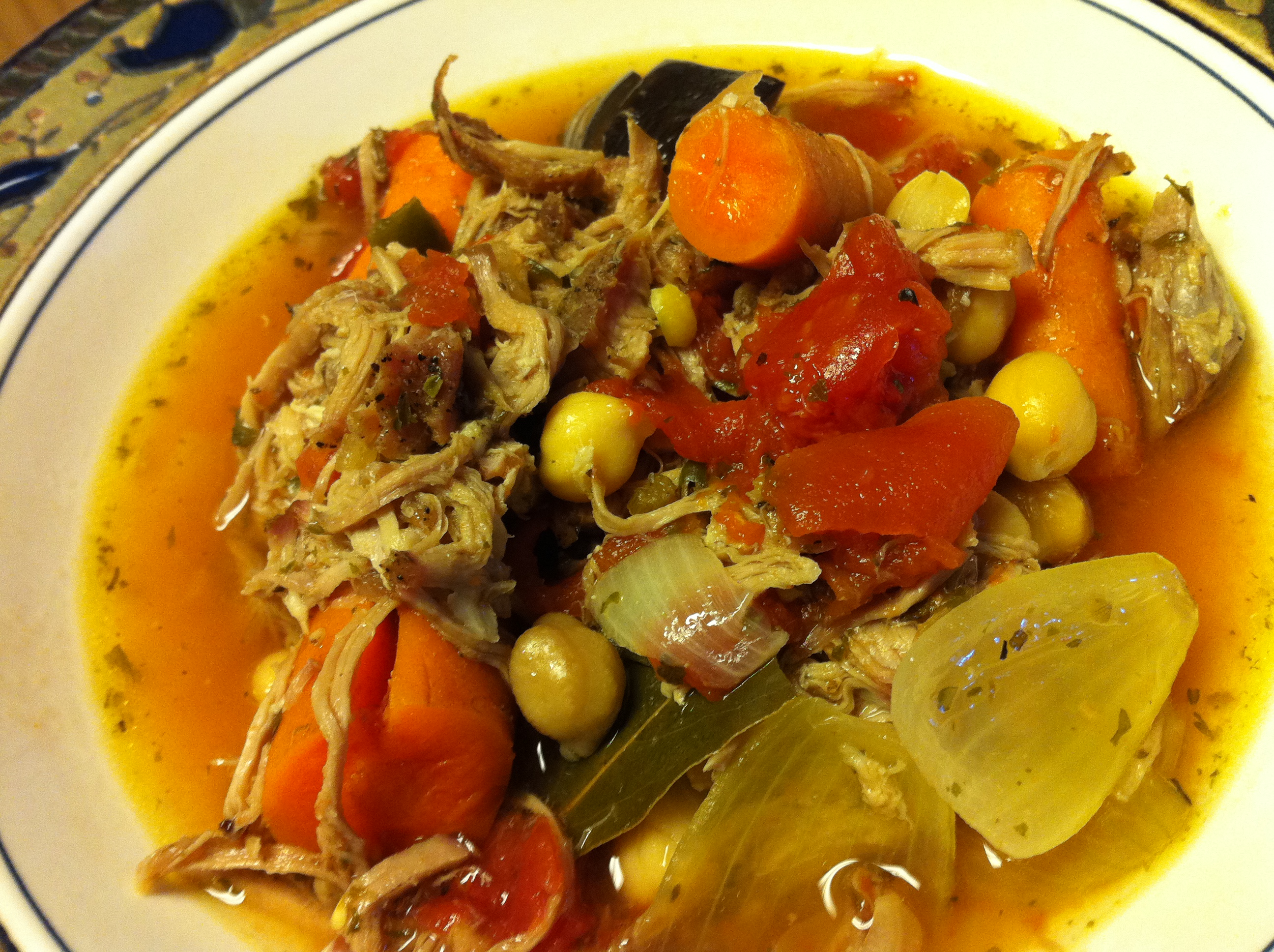 container in the refrigerator. This can be done a couple of days ahead. Place pork in bottom of the crock pot, 2 inches deep. Layer in chickpeas, tomatoes, onion, eggplant, carrots and garlic. Add remaining ingredients and set crock pot to low. Cook for 8-10 hours. To speed cooking time, increase heat to high and cook for 4-6 hours, stirring occasionally. To make this a stew, simply add flour to your broth.