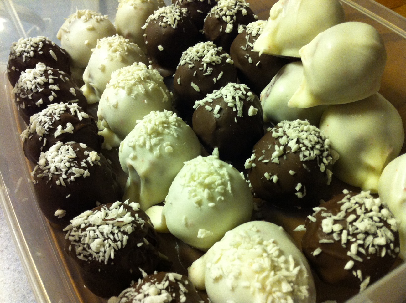 Melt chocolate according to instructions on the package. I used the microwave and it worked fine, but others may prefer a double broiler method. Once the chocolate is melted, remove the balls from the freezer and dunk them one by one into the chocolate until covered. This process is a bit tricky, but I discovered it’s easiest to dunk the balls in the chocolate and remove with a small fork, allowing the excess chocolate to drain off before placing them on a a cookie sheet lined with parchment paper until hardened. If you want to add embellishments to your truffles (I used coconut), you must do so immediately or the chocolate will harden and they won’t stick.