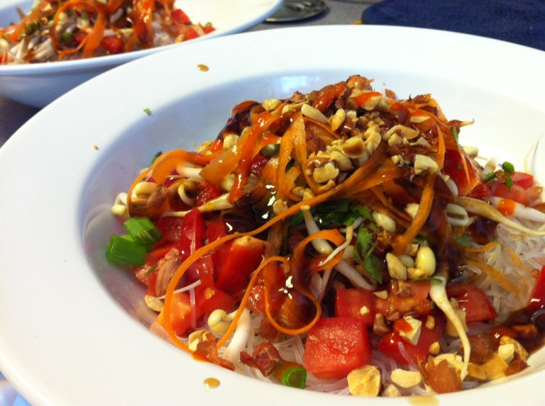Layer ingredients in a large bowl: cabbage, noodles, tomato, red pepper, bean sprouts, green onion, carrot, peanuts and cilantro. Add a generous amount of fish sauce and drizzle with oyster sauce, soy sauce and Sriracha.