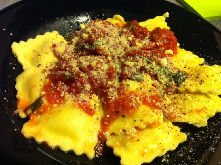 This is probably one of the easiest meals we’ve ever made. We used pre-made cheese raviolis and a jar full of tomatoes from last year’s garden. That’s about it. Seasoned with Parmesan cheese, garlic, salt and pepper, this dish was a great week night meal… filling, fresh and flavorful.