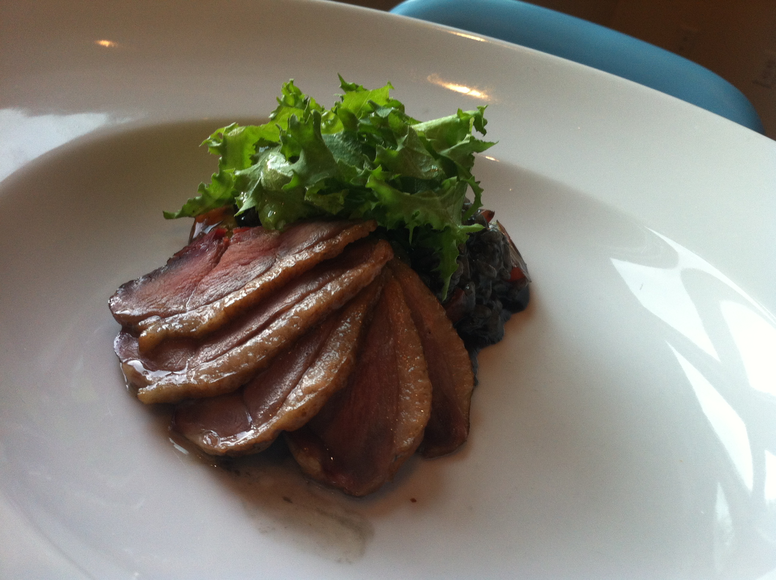 This was my favorite dish of the evening. The duck bacon had a nice light flavor and the texture was perfect- not crunchy like typical bacon, rather tender and juicy, with a thin layer of fat on one side to lend richness to the taste. Surprisingly, the black risotto was extremely cheesy and sticky, and while that turned Jon off a bit, I loved it. It was salty and comforting and complemented the smoky duck bacon.