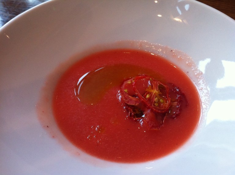 I love gazpacho and I’ve had strawberry gazpacho before, so I had to try this to compare it to others I’ve had. It is certainly one of the better I’ve had, but I am glad it is served in such a small serving size. By the time I was done, I was done- I don’t think I could have eaten anymore. It has just enough acid and tart to make it difficult to eat in large quantities. I loved the tomato crisps and will need to figure out how to make those. What a fun addition.