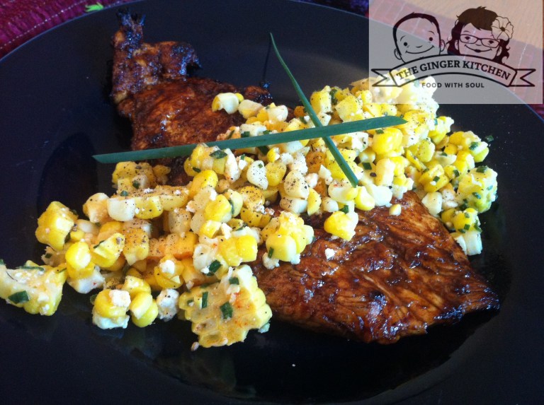 Looking for an easy week-night meal? This dish takes less than an hour and is super tasty. The spicy chicken is tempered by the chill from the salad, which contains just the right mixture of spices and cheese. Grilling the corn and cutting it from the cob adds a texture and flavor you wouldn’t get from canned corn.