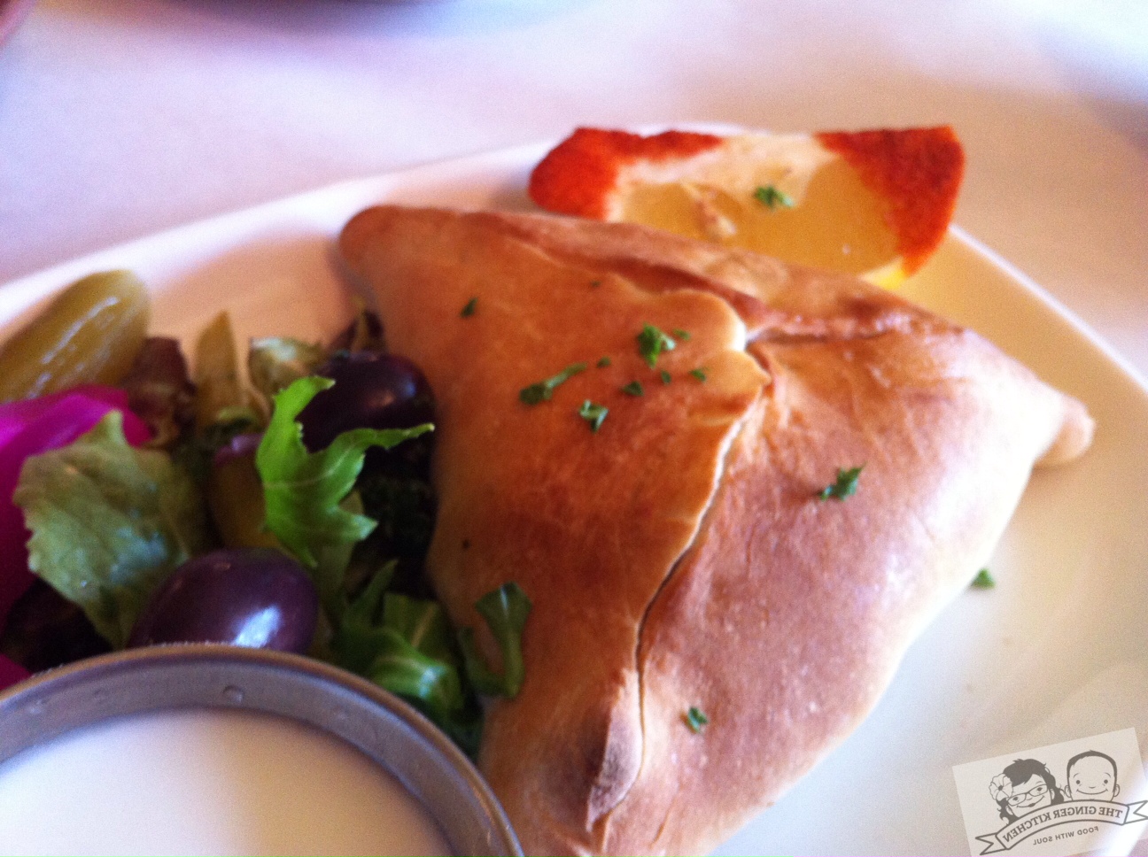 We rounded out our lunch with Lebanese Spinach Pie, listed as a side dish on the menu. It’s a soft pastry filled with spinach, onion, lemon, and sumac. We absolutely loved the prevalent taste of sumac, a deep-red or purple powder that adds an intense lemony flavor. This was a nice complement to our other selections.