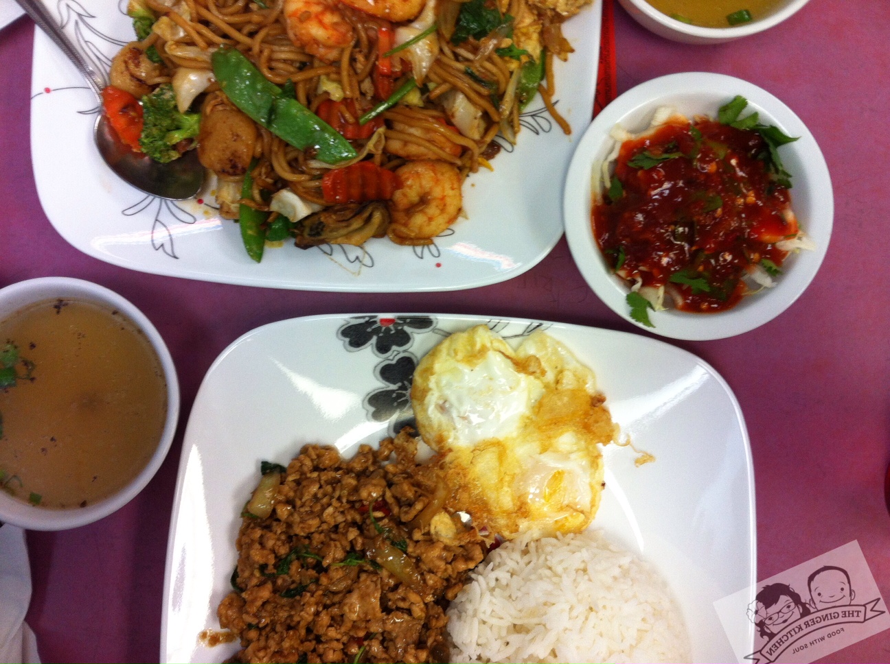 Jon chose Koa Pad Kra Prao, which is stir fried basil with choice of meat (he chose pork), served over rice with 2 eggs over easy. He ordered it medium spicy, which was plenty hot for his taste. Be sure to use the peanuts on the table with this dish- they temper the spices nicely and bring out the flavors of the ground pork and fresh basil.