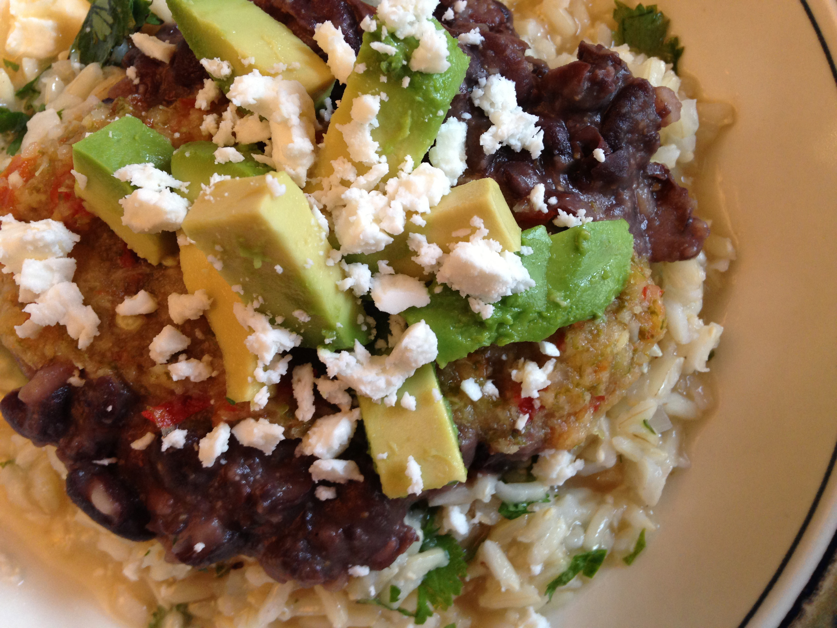 Serve rice with beans; top with salsa, avocado, cheese, 1/4 cup cilantro, and lime wedges.