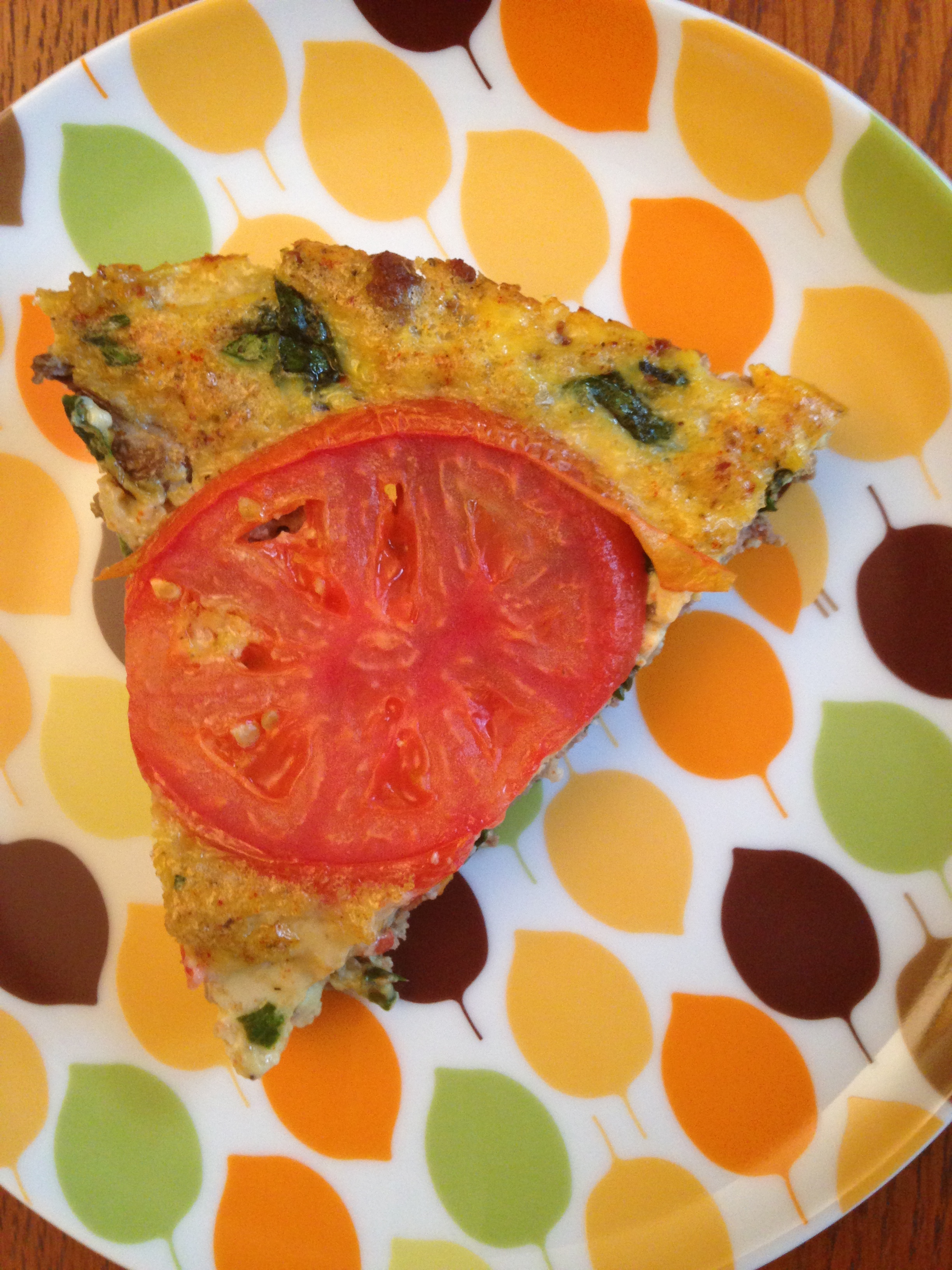 Preheat the oven to 350°F. In a large bowl, beat the eggs with the smoked paprika, salt and pepper, and set aside. In a large cast iron skillet over medium high heat, cook the meat until it’s cooked through. Add the onion and mushrooms and cook until softened and slightly tender. Add the spinach. Stir to combine. Pour the egg mixture into the skillet. Turn off the heat and stir the ingredients to combine. Lay the tomato slices on top. Place in oven and bake for about 20 minutes or until the eggs are set and not runny.