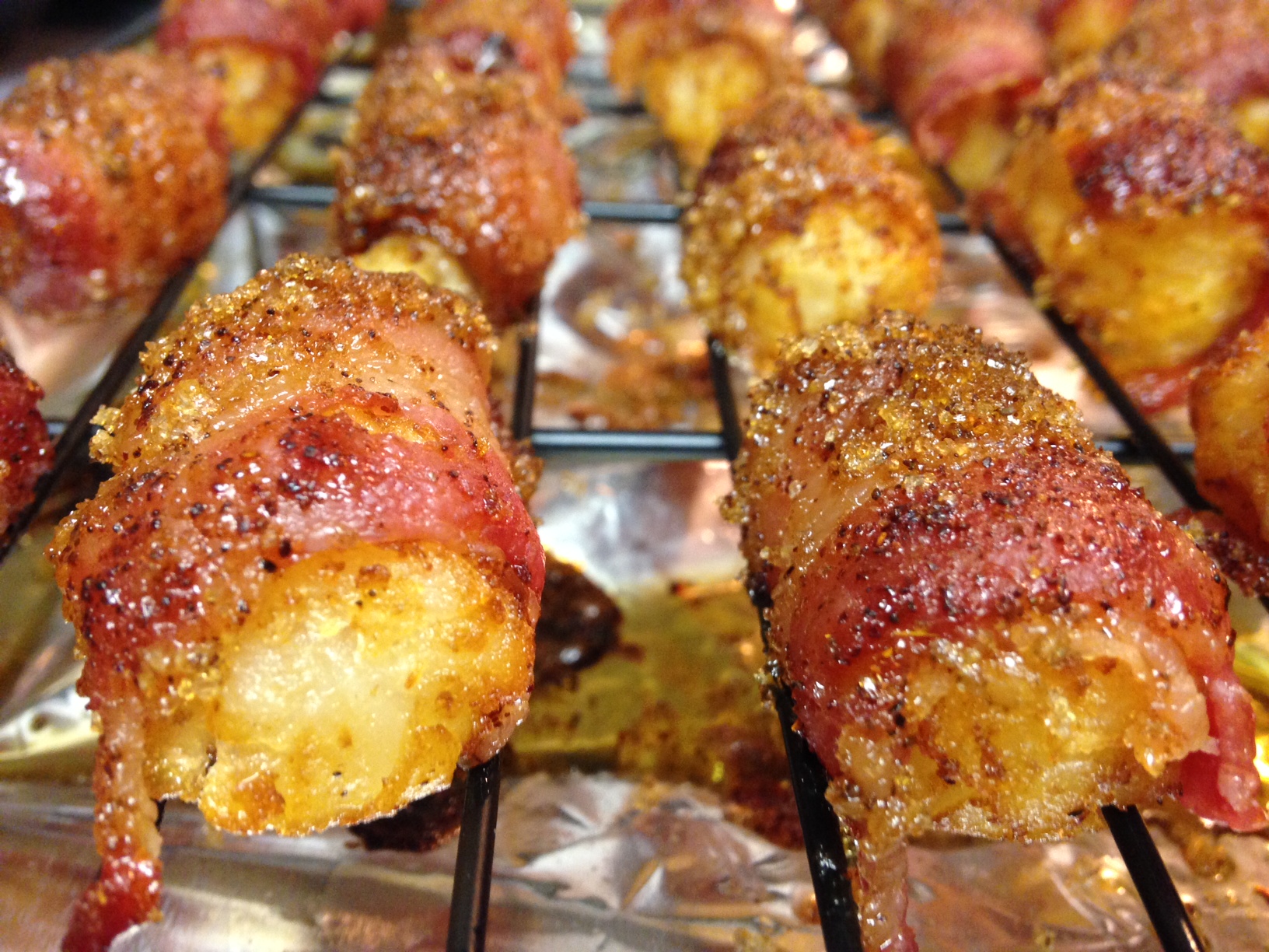 Preheat over to 375 degrees. Line a cookie sheet with foil and place a cooling rack on top of the pan. In a small bowl, mix brown sugar and chili powder. Wrap each tater tot in bacon and then roll it in the brown sugar mixture. Place on top of the cookie rack. Bake about 10 to 15 minutes at 375, then increase the oven to 400 and let them cook another 5 minutes. Continue to cook in 5 minutes increments, checking for crispiness (I pulled mine out after 3 additional 5 minute increments). Best served warm.