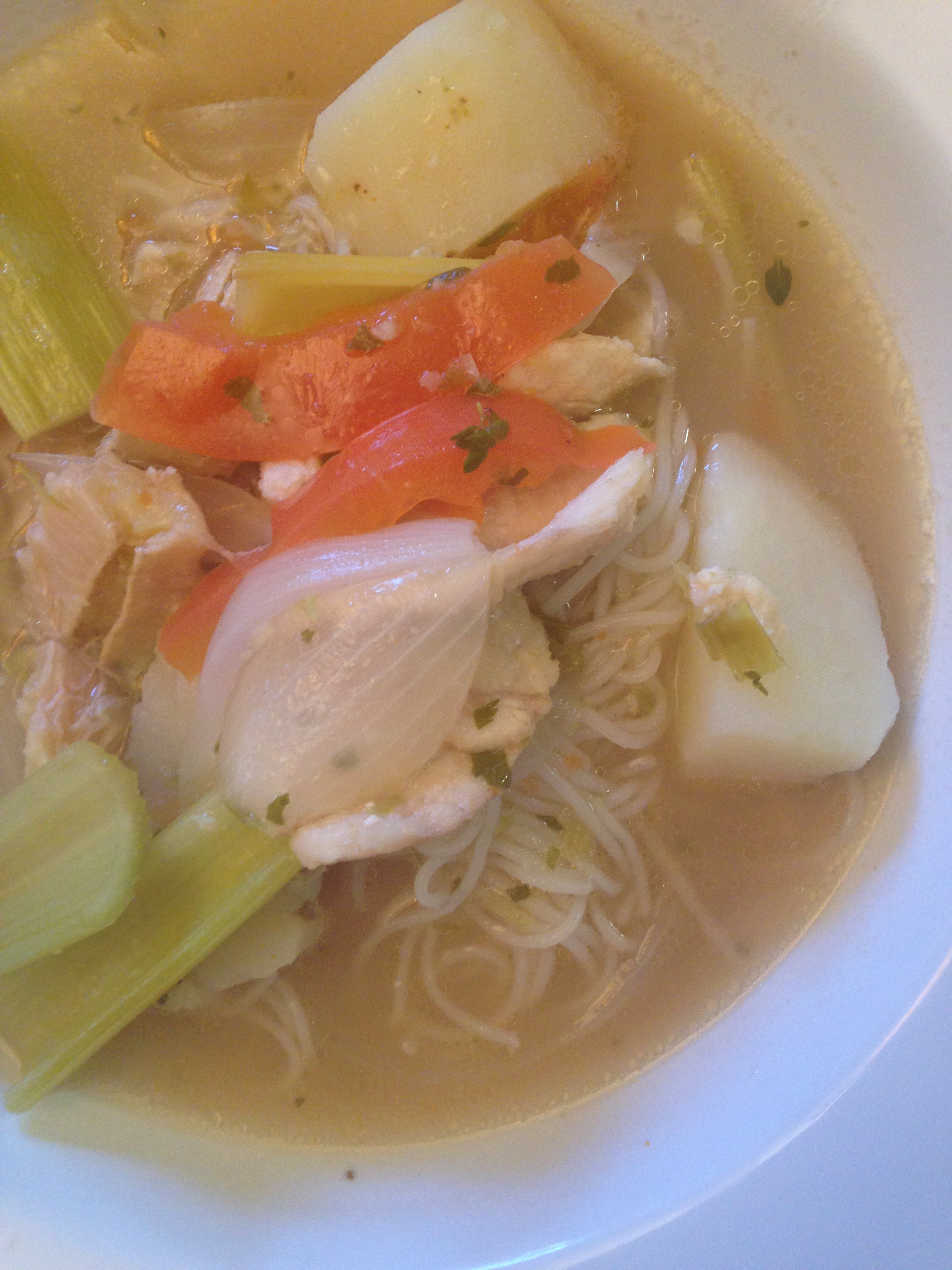 Last weekend, our friend Adam from Get Fresh Farms, delivered some fresh tilapia to us and we made Grilled Tilapia Tacos with Pear Bell Pepper Salsa and Best Boy Brunette Sauce. Yummy! We had a bunch of fish bones leftover so we decided to throw them in a big stock pot with water, onion, carrot, and celery to make some fish stock. This weekend, we used the fish stock to make delicious Trinidad Fish Brof. I don’t know if I’ve ever had cuisine from Trinidad, but if this dish is any indication of what to expect, count me in. Of course, we are fans of flavorful noodle soups, similar to Vietnamese Pho. I especially like the large chunks of root vegetables, and oddly enough, the bananas.
